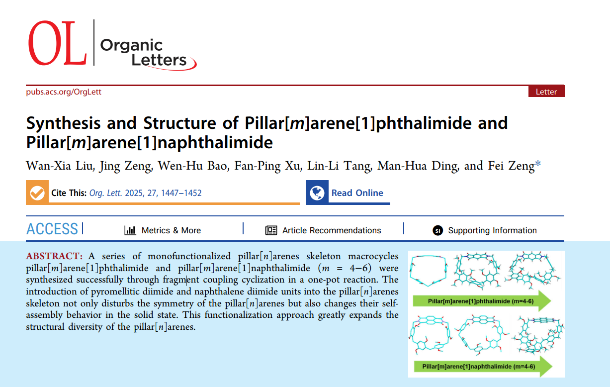 (本网讯 曾飞)近日,化学与生物工程学院2022级化学专业本科生刘晚霞以第一作者身份在国际知名期刊Organic Letters(中科院一区TOP)上发表题为《Synthesis and Structure of Pillar[m]arene[1]phthalimide and Pillar[m]arene[1]naphthalimide》(柱[m]芳烃[1]苯邻二甲酰亚胺与柱[m]芳烃[1]萘二甲酰亚胺的合成及结构)的高水平科研论文,是世界杯官网本科生人才培养质量进一步提升和学科专业建设的标志性成果。