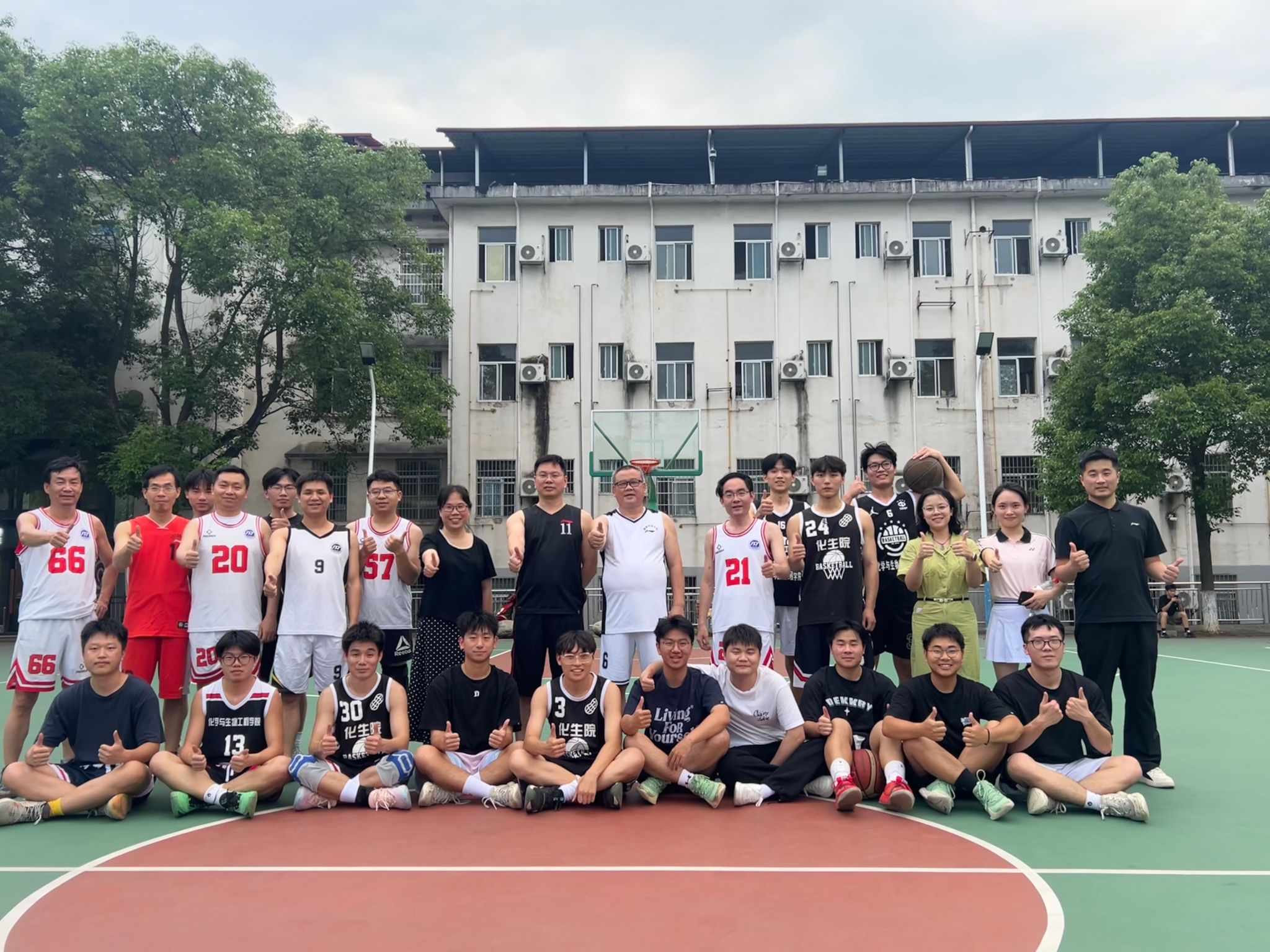 篮球对抗赛上,在三分线外的跳投与禁区内的强攻中,教师队与毕业生队你来我往,比分交替上升,战况异常激烈,双方最终以46:46的平局结束比赛。毕业生陈博在赛后采访中表示:“通过师生篮球赛,我们记住了老师起跳投篮时教给我们的‘人生也要找准发力点’。”