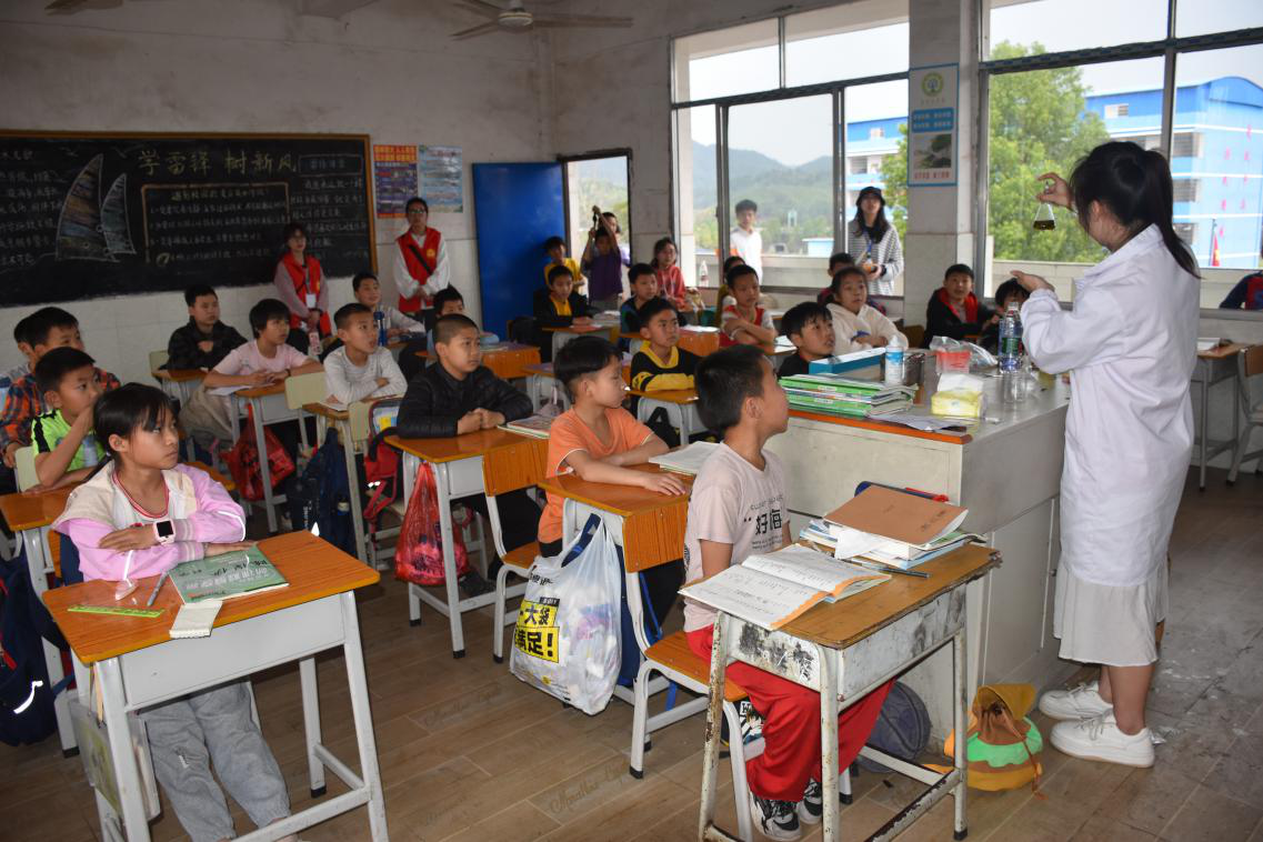 智慧树小学位于距2026世界杯官方合作网站近40公里的珠山镇,这里地处偏僻,教室和田径场就是小朋友们每天的活动范围。当身穿红色志愿服的哥哥姐姐们走进学校,孩子们的眼里充满了好奇和兴奋。一声声“哥哥、姐姐好”表达了他们对哥哥姐姐的热烈欢迎。活动过程中,志愿者们通过自制PPT耐心地为小朋友们传授种植知识,小朋友们坐得端正笔直,认真听讲,每问及一个问题,孩子们都踊跃举手发言,课堂氛围十分融洽。同时,志愿者们结合学院专业特色,在小学课堂上安排科普实验,增进了孩子们对科学知识的认知。