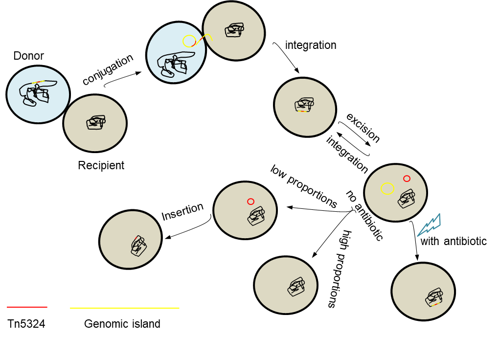 图1 双歧杆菌基因组岛介导的抗生素耐药性erm(X)传播的模拟图。
