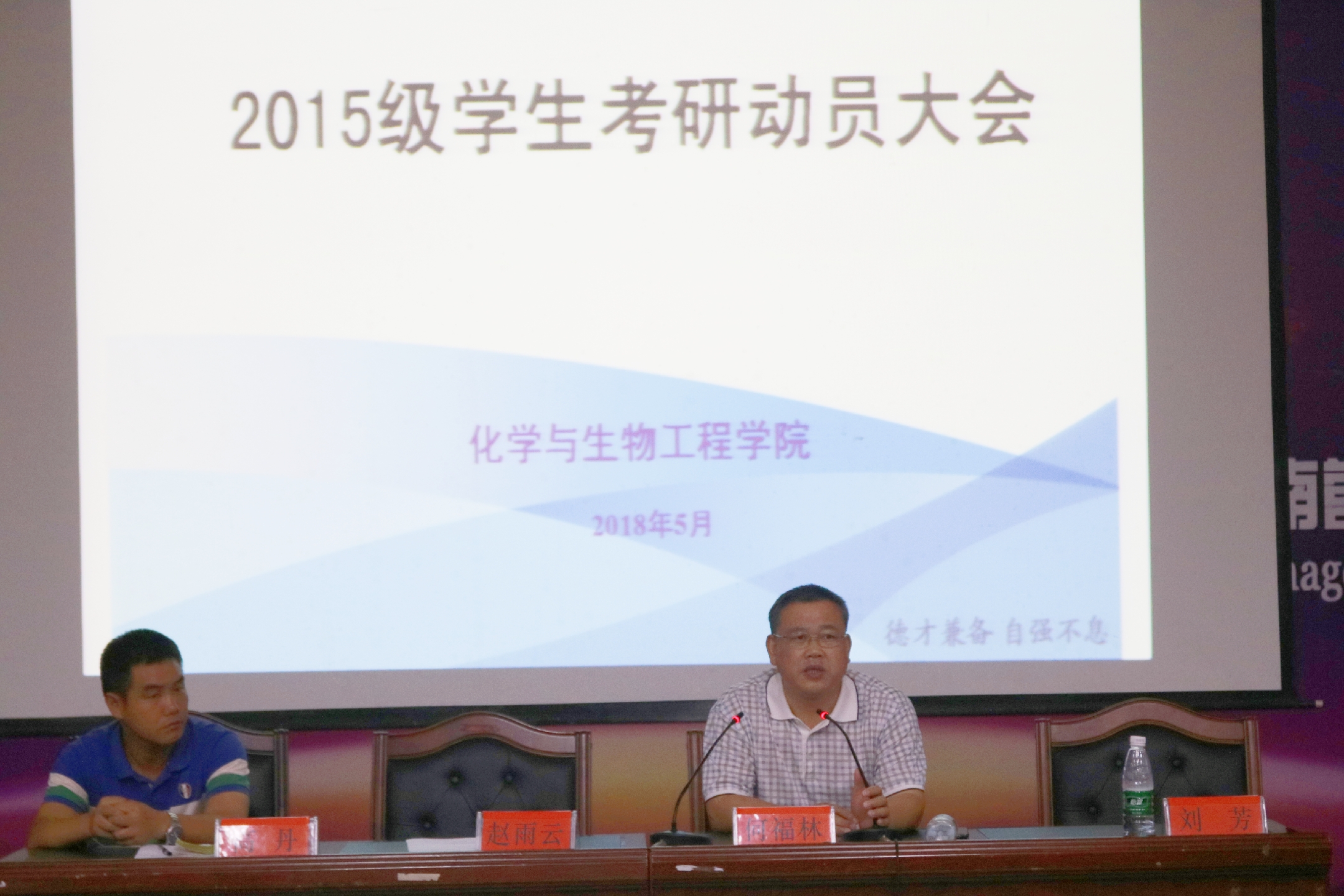 本网讯(通讯员 唐婉婷)5月22日下午,化学与生物工程学院在明德楼一楼报告厅举行了2015级实习动员会暨考研动员大会。院长何福林、党总支书记赵雨云、副院长刘芳、欧光川、刘小文、党总支副书记高丹出席,副院长刘小文、刘芳分别主持会议。