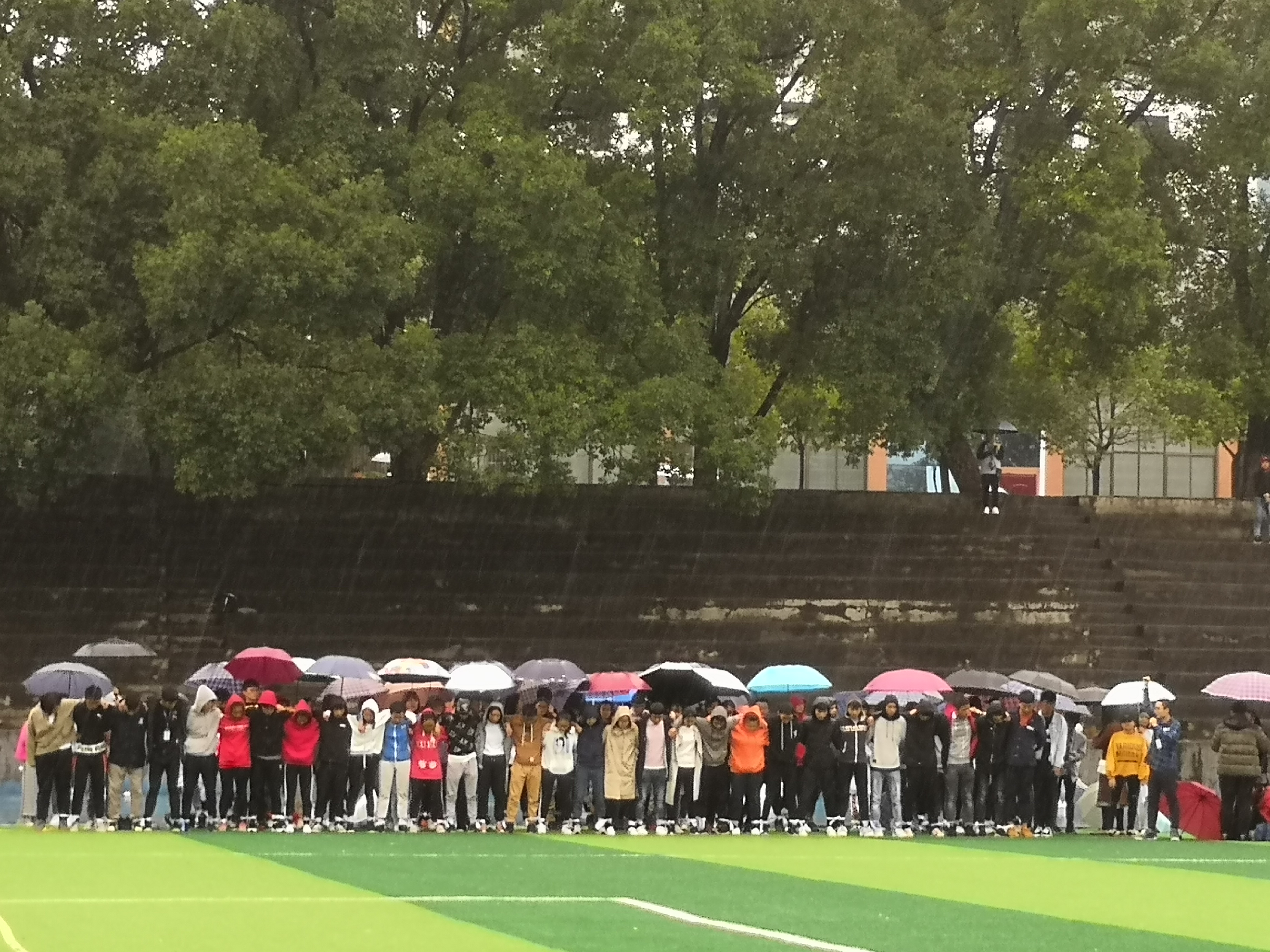 当日十二点,各班队伍已经准备就绪,面对突如其来的雨,比赛不得不推迟半个小时。面对越下越大的雨,在征求各参赛队伍的意见后,比赛冒雨继续进行。一个个参赛的队伍喊着整齐的“一二一、一二一、一二一……”口号,相互搀扶,互相鼓劲,在雨中充分地燃烧青春的壮志和激情。跑进途中遇到有人跌倒,所有人都自发停下来,站起来、扶起来、跑起来,所有的队伍都坚持跑完了全程,即使没有取得名次,但可以看出来,每个人都很开心,以此为一次难忘的经历。