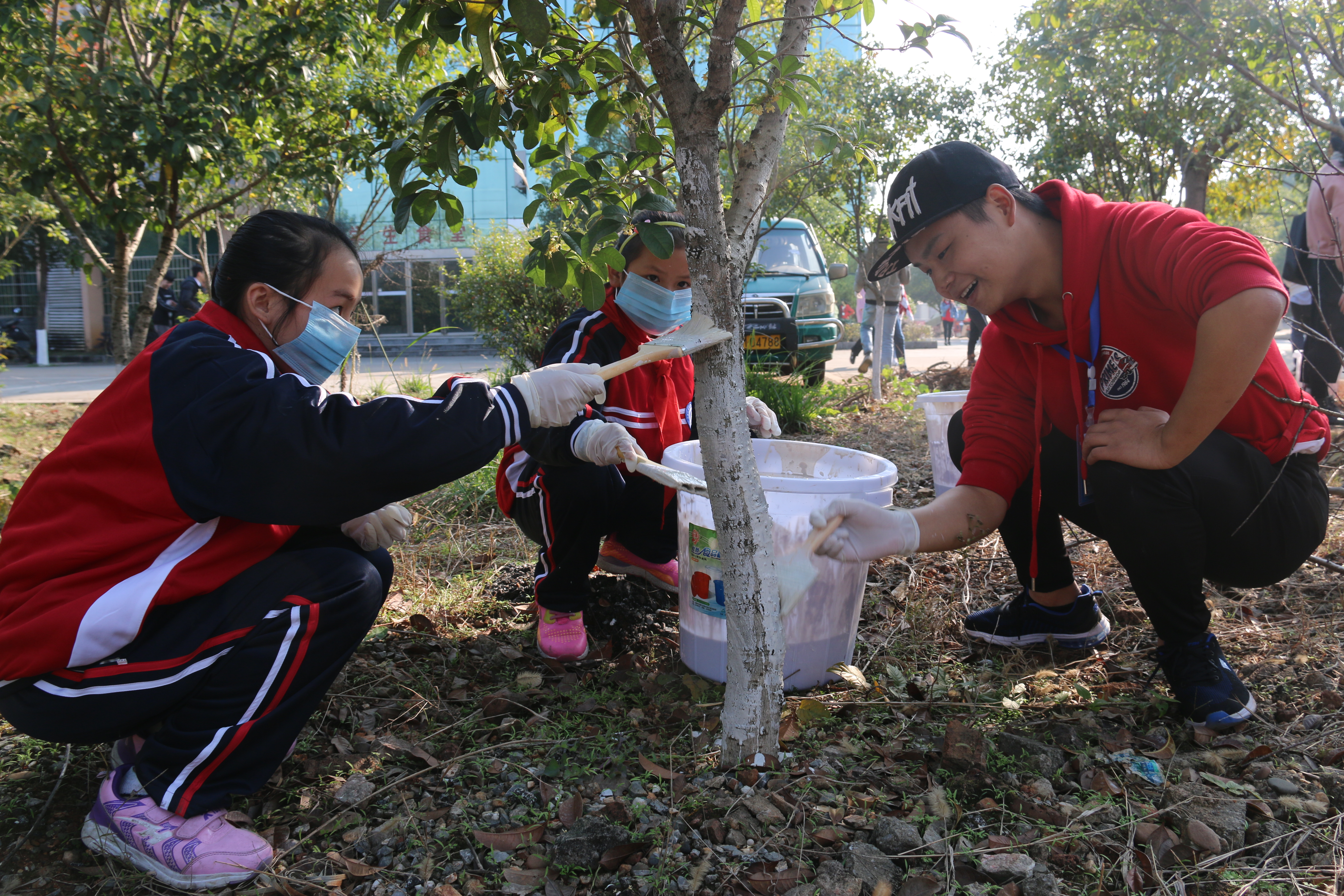 下午1点30分,同学们与小朋友们便已到达活动地点集合。工作人员简短地解释了粉刷树木的作用与目的,并说明一些活动注意事项。随后,在工作人员给大家分发完活动必需工具——刷子和手套后志愿者们开始进行分组,采取“以大带小”的模式分别刷树。大家都怀着兴奋的心情,互相配合、互相帮忙,认真地用刷子粘好刷树液,然后细心地刷在树所需要保护的部位。