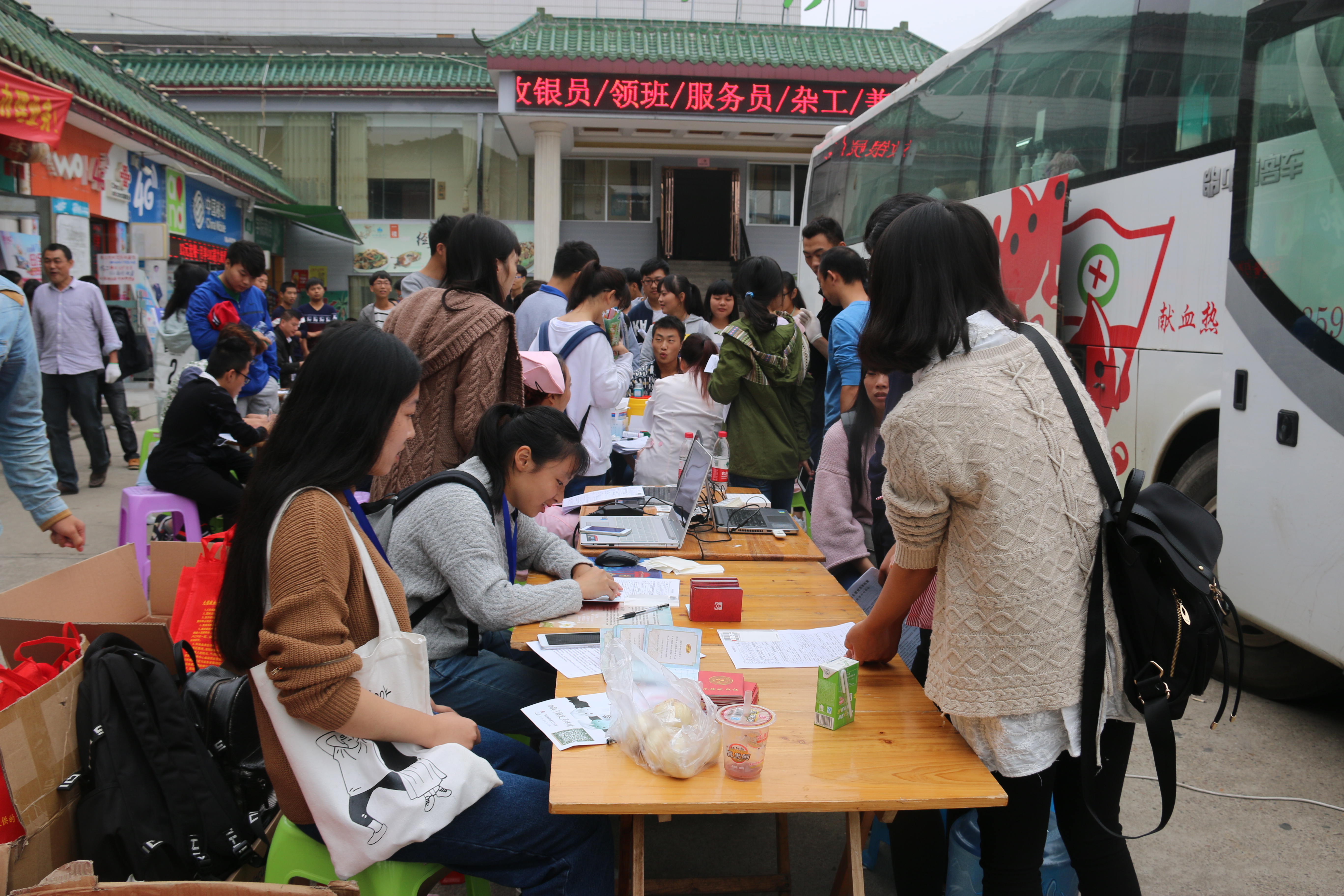 在志愿团的组织下,献血者按顺序进行填表登记、血型检测和抽血。在工作人员的讲解和鼓励下,每一位奉献爱心的同学都献出了300ml或400ml的鲜血。