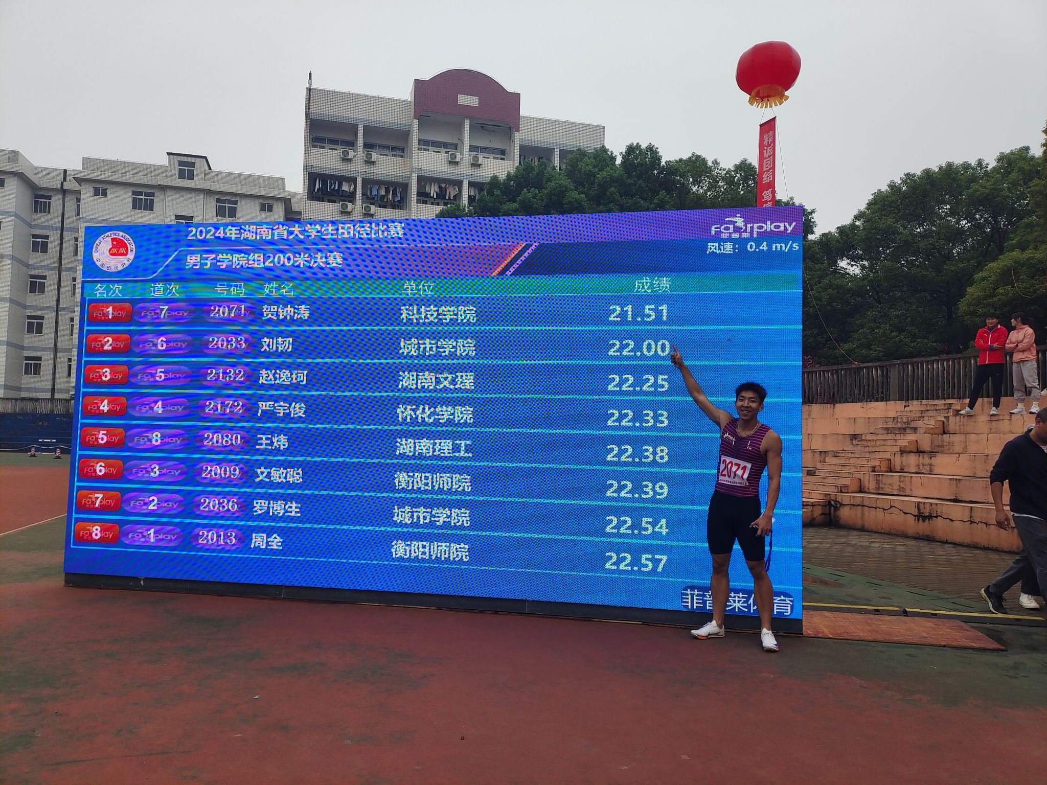 本网讯(通讯员 黄婉 贺钟涛)近日,2024年湖南省大学生田径比赛在湘潭举行。世界杯官网体育学院2022级体育教育专业学生贺钟涛过关斩将,勇夺男子学院组100米、200米双冠,实现了世界杯官网在相关体育赛事领域的历史性突破!