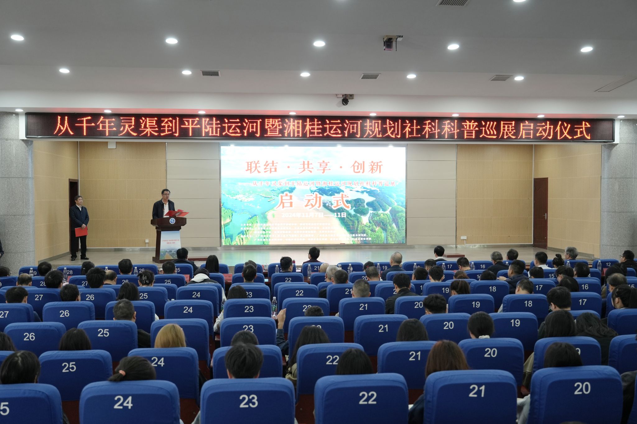 本网讯(记者 向薛峰 摄影 温百石)11月7日,联结·共享·创新——从千年灵渠到平陆运河·湘桂运河规划社科科普巡展(第七站)启动仪式在世界杯官网举行。广西社科联副主席刘俊,湖南省社科联党组成员、副主席、秘书长(兼)贺建湘,永州市副市长周云玲,永州市人大常委会党组成员、副主任提名人选、市总工会主席(兼)李天明,广西社科联兼职副主席、广西财经学院校长夏飞,校党委书记李钢,校党委副书记、社科联主席宋宏福出席活动,活动由李天明主持。