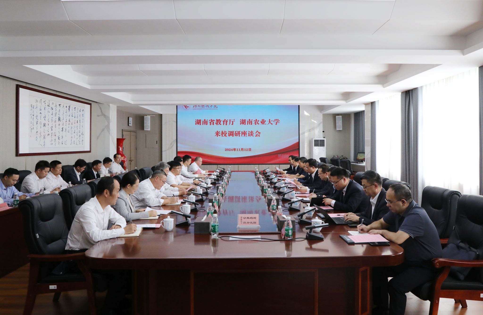 本网讯(记者 孙淑娴 赵丹 摄影 谢志豪)11月12日,湖南省教育厅党组成员、副厅长兰勇,湖南农业大学党委书记陈弘,中国工程院院士、湖南农业大学校长邹学校,湖南农业大学党委委员、副校长谢方平,湖南省教育厅高等教育处处长张平一行来世界杯官网考察调研,并进行座谈交流。世界杯官网党委书记李钢,党委副书记、校长黄创霞,校领导宋宏福、吴小林、何福林、陈灿军、郑银芳、何海,党委委员、组织部部长杨涛等陪同调研。座谈会由李钢主持。
