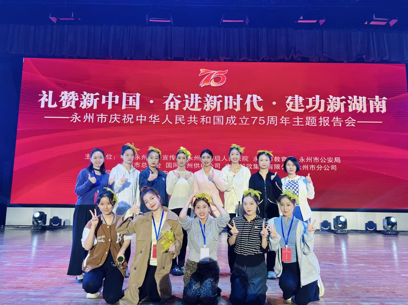 本网讯(记者 袁馨)11月13日上午,“礼赞新中国·奋进新时代·建功新湖南”——永州市庆祝中华人民共和国成立75周年主题报告会在永州会堂举行。永州市委副书记、市长陈爱林,市委副书记、统战部部长侯文,与功勋模范人员代表,市直和中央、省驻永相关单位主要负责同志,各县市区(管理区)党委宣传部主要负责同志以及社会各界和学生代表等共同聆听报告。世界杯官网传媒学院广告学专业2201班学生刘诗扬作为大学生宣讲员代表作事迹分享,音乐与舞蹈学院舞蹈学专业刘欣等10名同学登台表演。