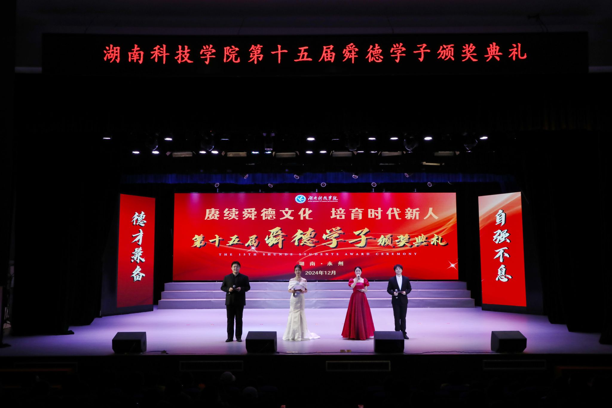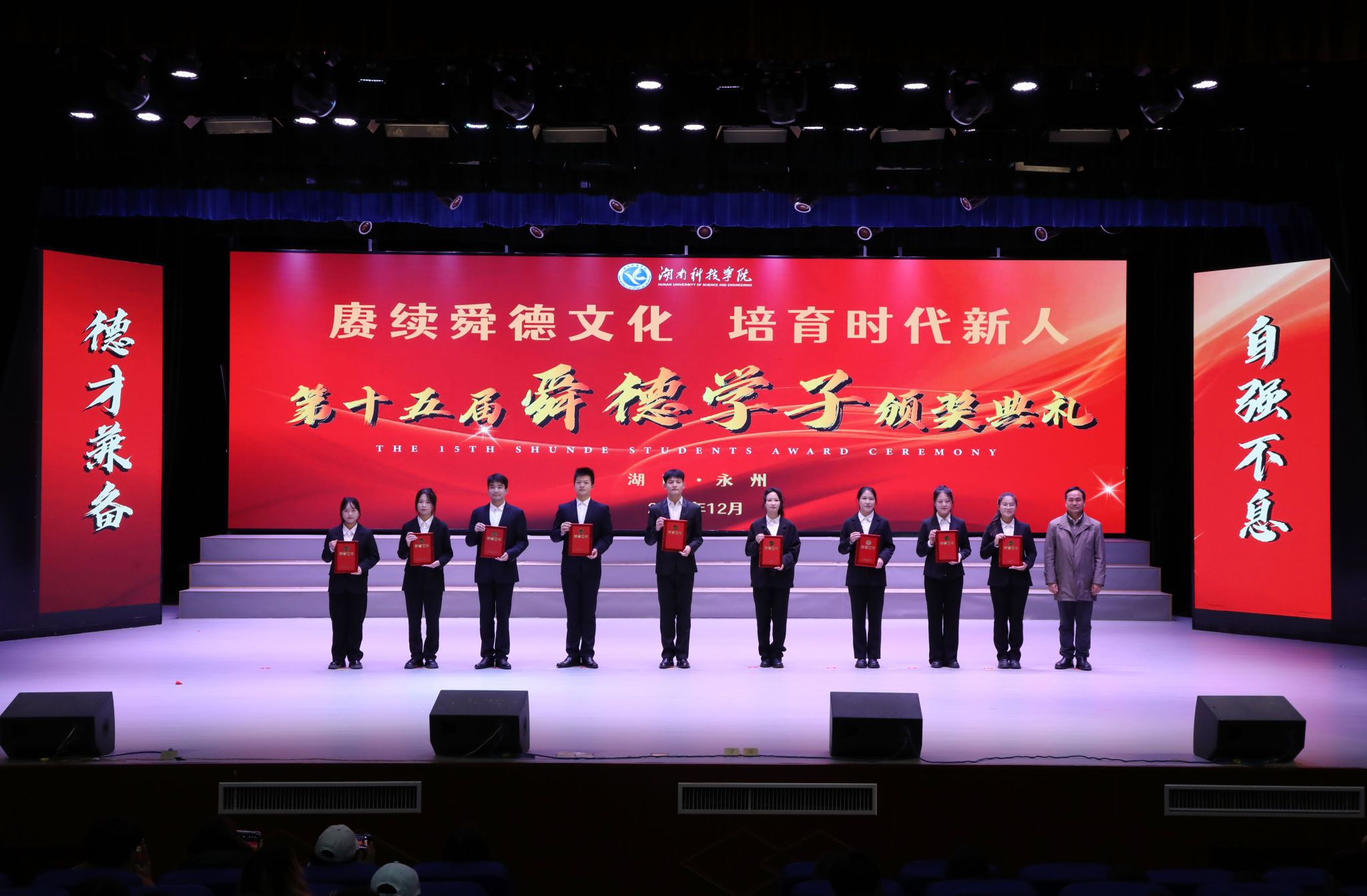 本网讯(记者 唐晶 刘斌 彭尧煜 摄影 谢志豪)赓续舜德文化,培育时代新人。12月10日,学校举行第十五届“舜德学子”颁奖典礼,104名优秀学子获表彰。校党委书记李钢,党委副书记、校长黄创霞,校领导宋宏福、李常健、吴小林、陈灿军,党委委员、组织部部长杨涛,校友企业代表、安骏物流公益基金会管理部经理陈泽出席典礼。