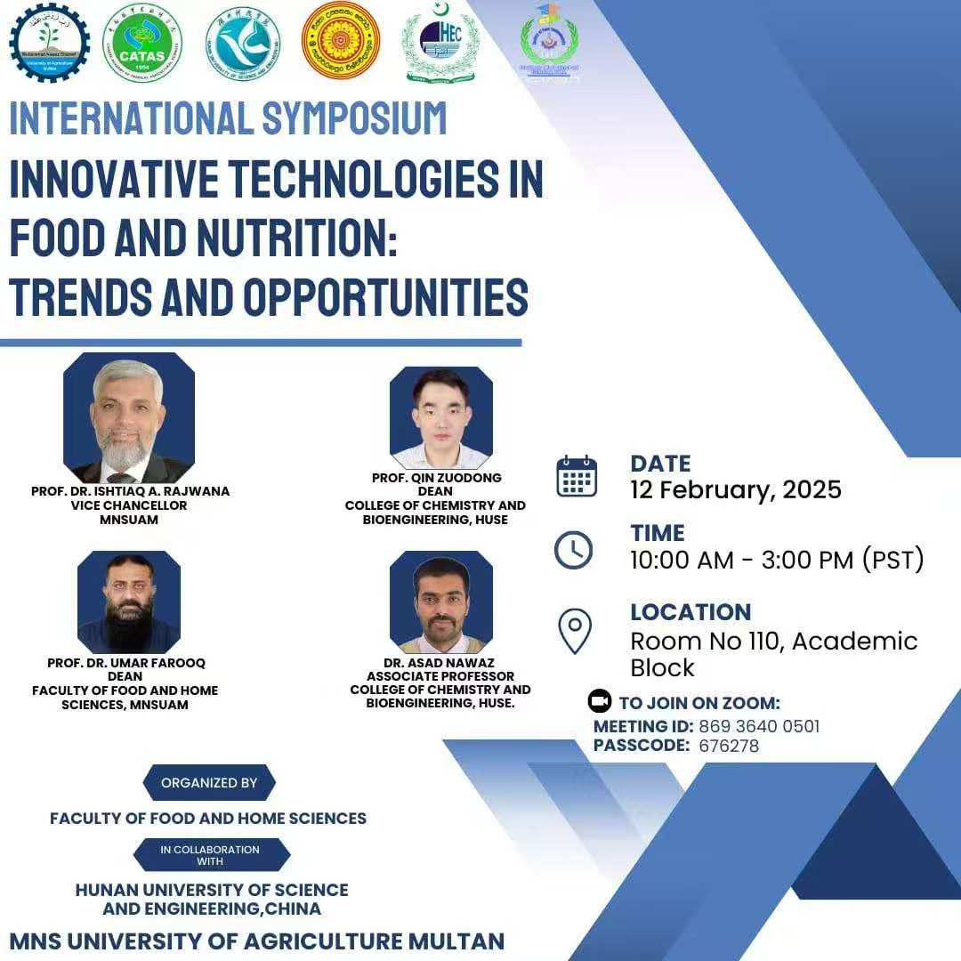 本网讯(通讯员 汪美凤)2月12日,由巴基斯坦Muhammad Nawaz Shareef University of Agriculture联合世界杯官网组织发起的“Innovative Technologies in Food and Nutrition: Trends and opportunities”(食品与营养创新技术:趋势与机遇)国际研讨会在巴基斯坦木尔坦以线上线下相结合的方式成功召开。来自巴基斯坦、中国、斯里兰卡等国家和地区的百余名专家学者出席了本次研讨会,共同探索食品营养的最新技术与未来发展趋势。
