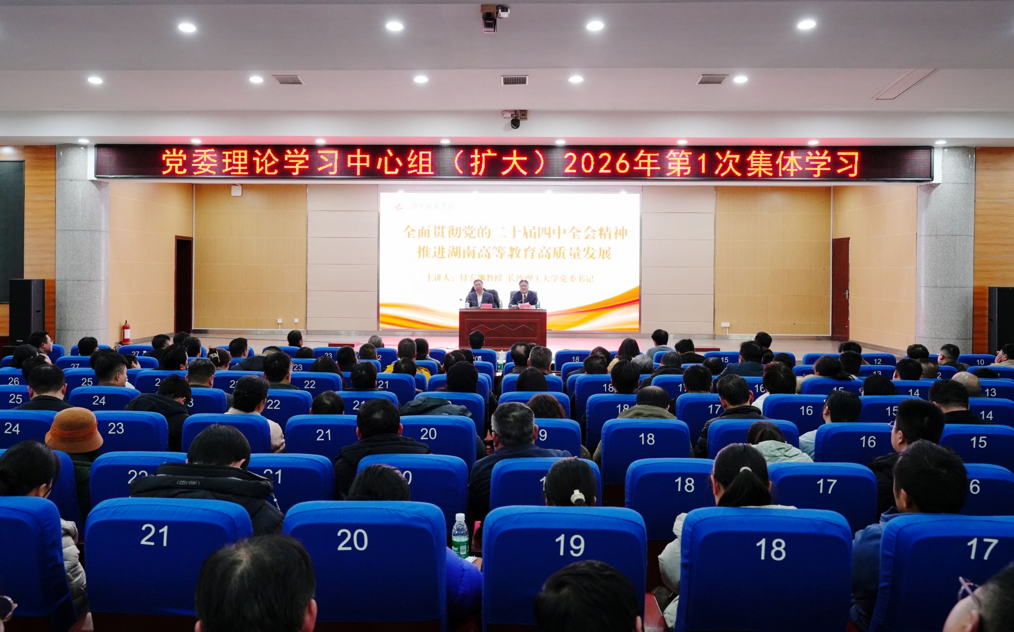 本网讯(记者 张云芳) 1月6日下午,学校党委理论学习中心组(扩大)举行2026年第1次集体学习,特邀长沙理工大学党委书记付宏渊教授来校作题为《全面贯彻党的二十届四中全会精神,推进湖南高等教育高质量发展》的辅导报告。校党委书记李钢,党委副书记、校长黄创霞等全体在校校领导出席报告会。李钢主持报告会。