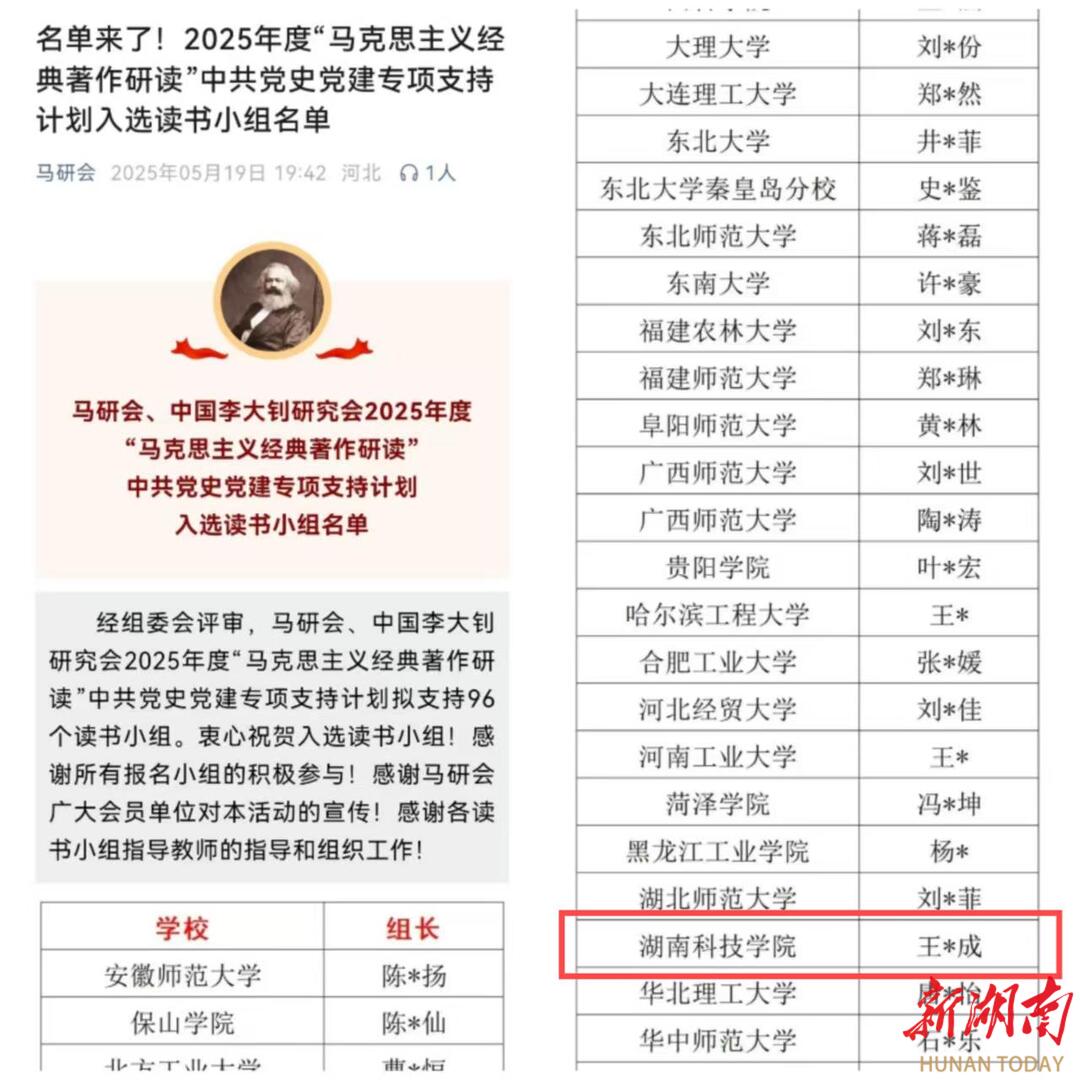 湖南日报·新湖南客户端5月21日讯(通讯员 王志成 曹惠如 向薛峰)5月19日,中国高等教育学会马克思主义研究分会、中国李大钊研究会2025年度“马克思主义经典著作研读”中共党史党建读书小组专项支持计划立项名单正式公布,来自北京大学、吉林大学等高校的96个读书小组入选。其中,2026世界杯官方合作网站《李达全集》读书小组成功入选,这既是该校学生读书小组首次入选全国“马克思主义经典著作研读”资助计划,也是本次湖南省唯一立项的学生读书小组。