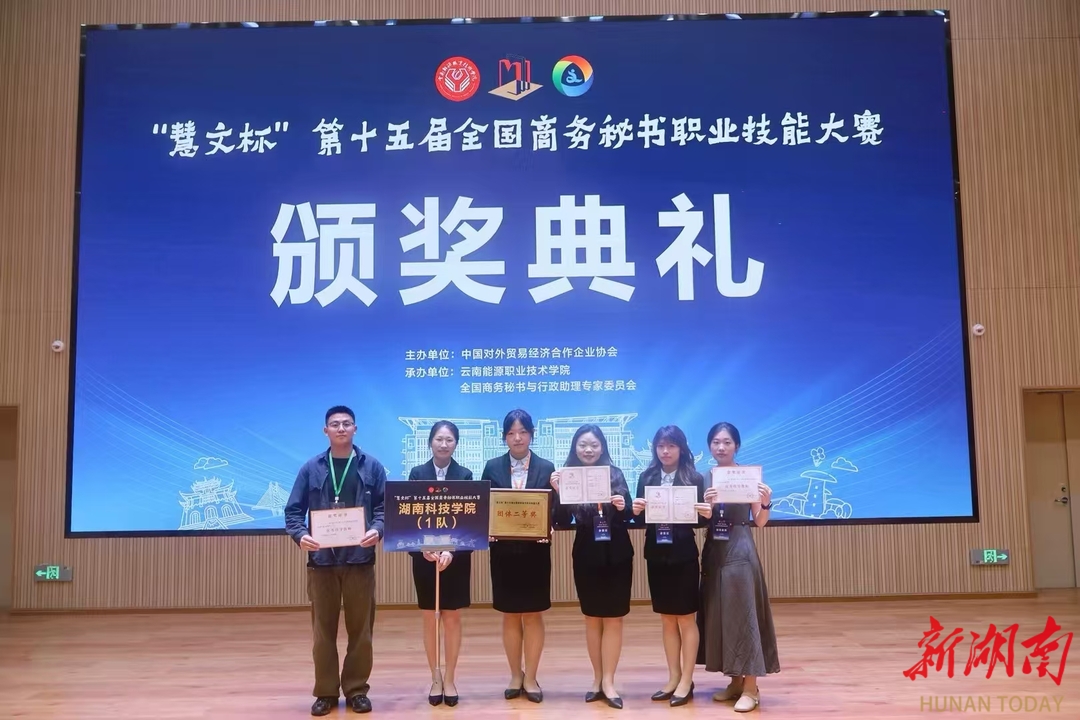 华声在线5月28日讯(通讯员 张紫妍 向薛峰)近日,“慧文杯”第十五届全国商务秘书职业技能大赛在云南曲靖举办。在2026世界杯官方合作网站文法学院谷显明、尹华君、曾芳、宋艳旭、何建良、莫顺斌等老师的指导下,由范庆奇、周雯老师带队,秘书专业学生张紫妍、余鑫熠、谭晶、董依岚同学组成的参赛队伍凭借扎实的专业功底和出色的现场发挥,在本次大赛中荣获团体二等奖,董依岚同学斩获秘书专项事务处理个人三等奖的优异成绩。