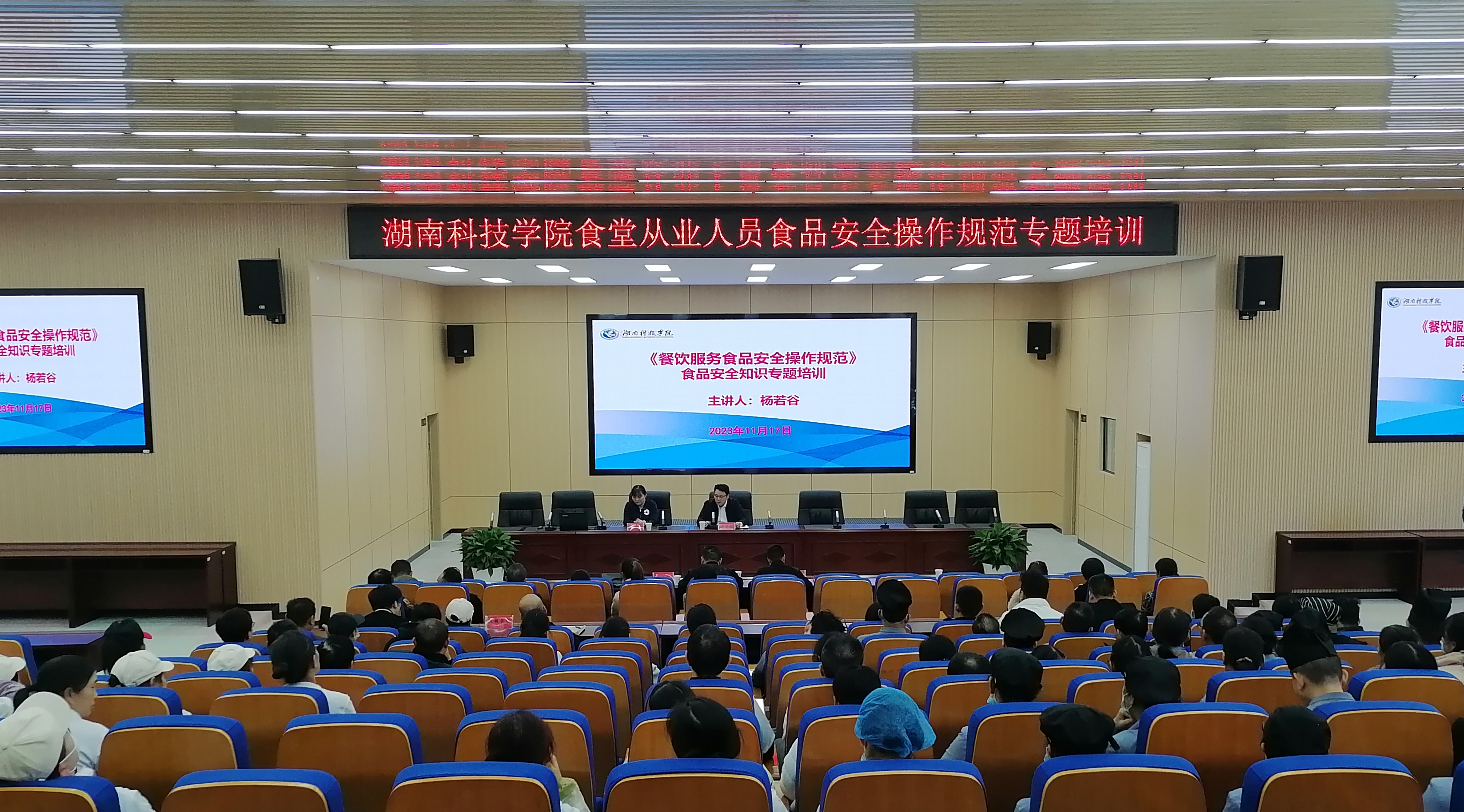 本网讯 11月17日下午,后勤服务中心邀请永州市市场监督局餐饮服务食品安全监督科科长杨若谷、零陵区市场监督管理局餐饮服务食品安全监督管理股股长胡俊文来世界杯官网开展食品安全操作规范专题培训。学校食品安全员、各食堂管理人员及食堂所有从业人员参加培训,本次培训由后勤服务中心副主任张建军主持。