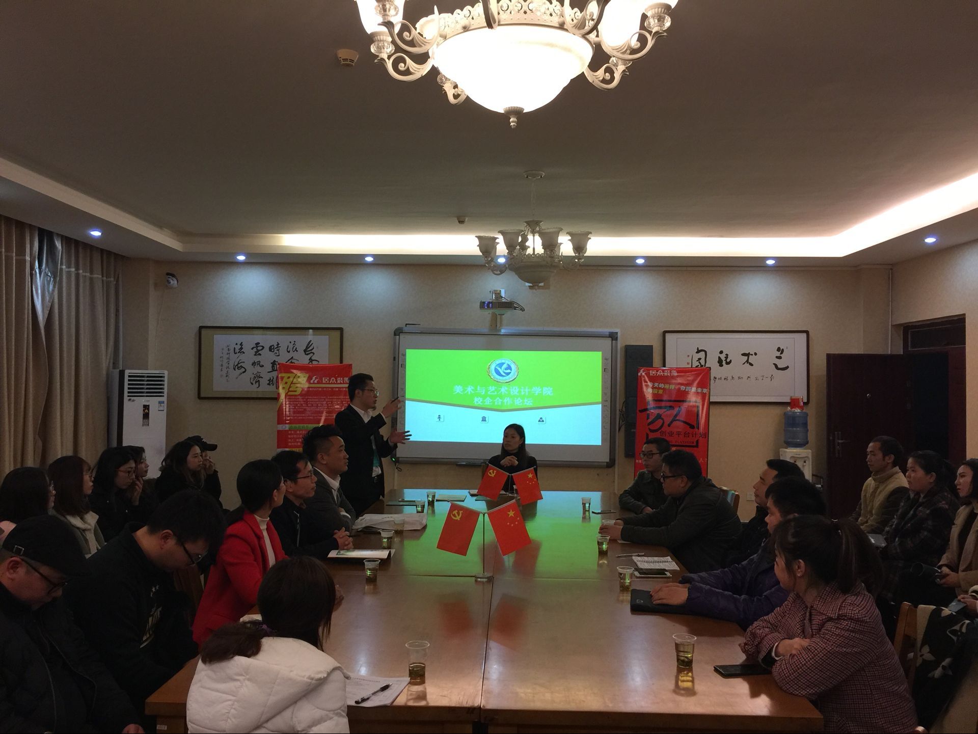 本网讯 12月1日晚,美术与艺术设计学院举行校企合作论坛,深圳居众装饰、后湖国际、地平线广告、永州市广告协会会长等企业单位负责人出席。