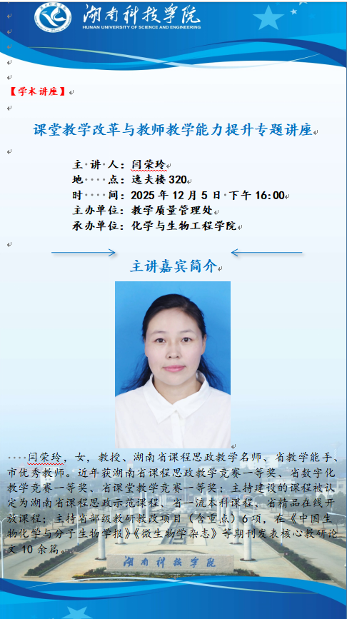 本期活动特邀请化学与生物工程学院闫荣玲老师和肖新生老师,和大家一同探索教学竞赛如何驱动教学新范式,从备赛方向、参赛技巧,分享获奖经验,提升教师备赛参赛的针对性与实效性,拓展教学改革的新视野。