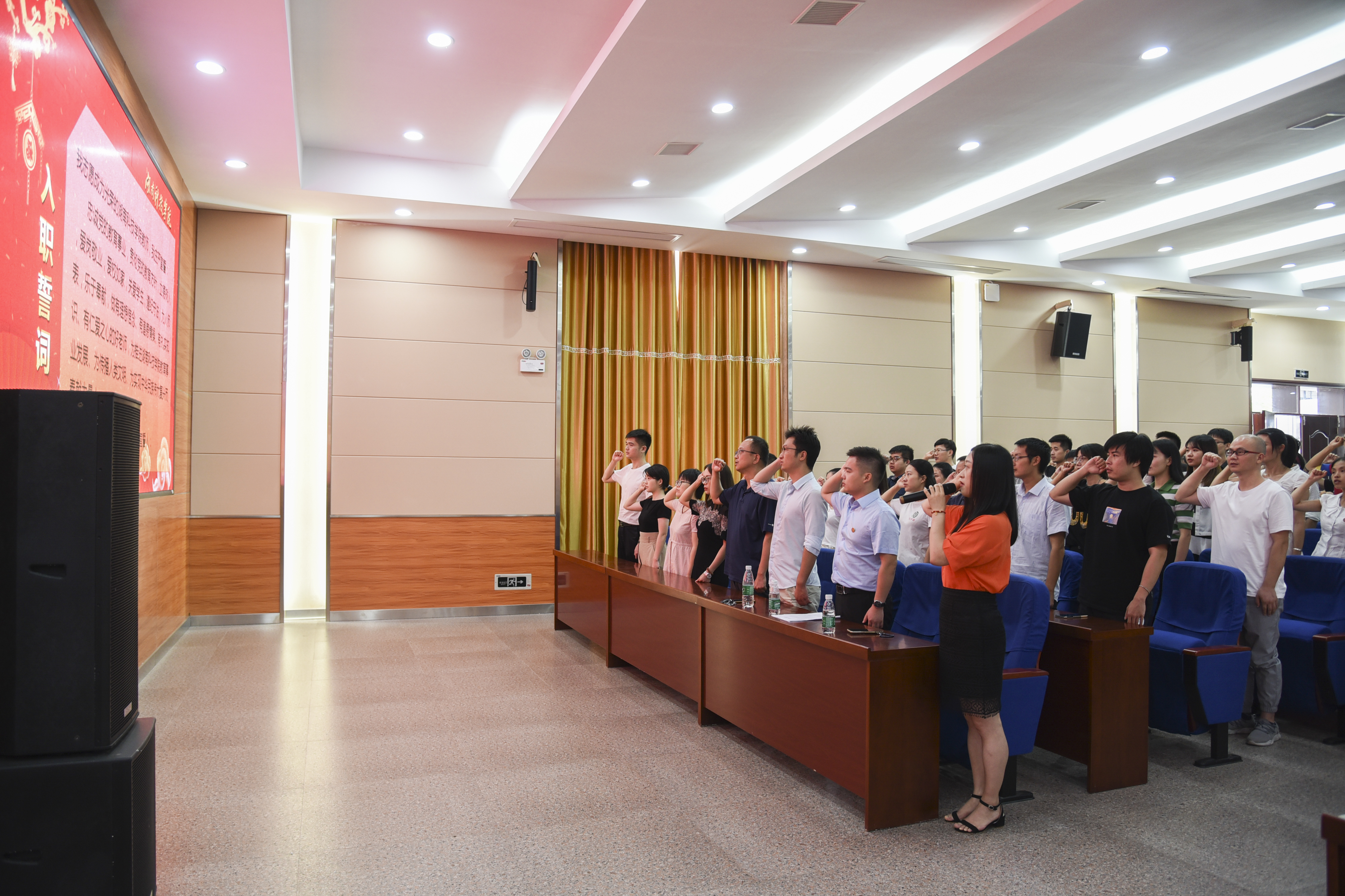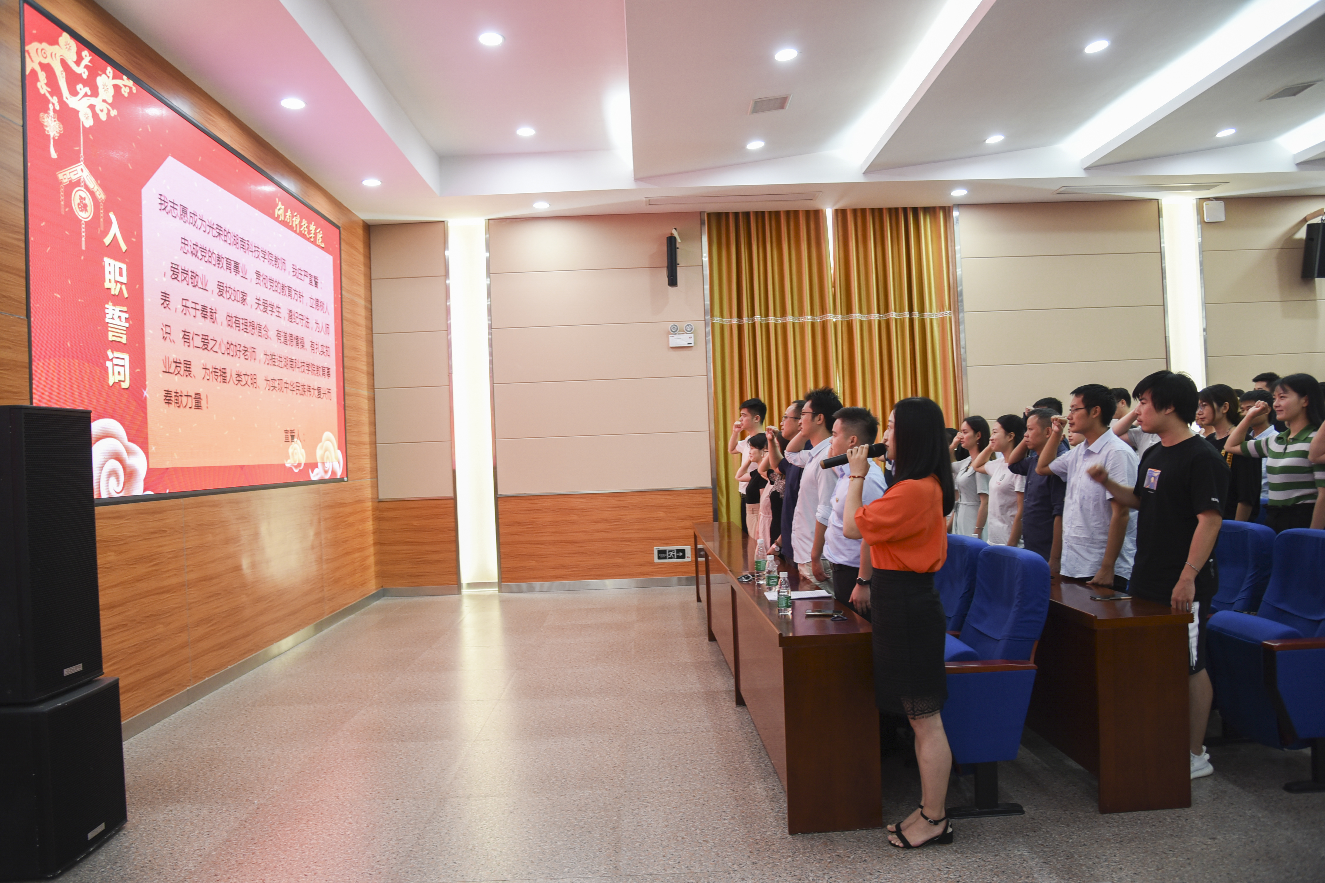 在播放完专题片《习近平总书记与人民教师在一起》后,2019年新进教师进行了入职宣誓,大家表示要做有理想信念,有道德情操、有扎实知识,有仁爱之心的好老师。