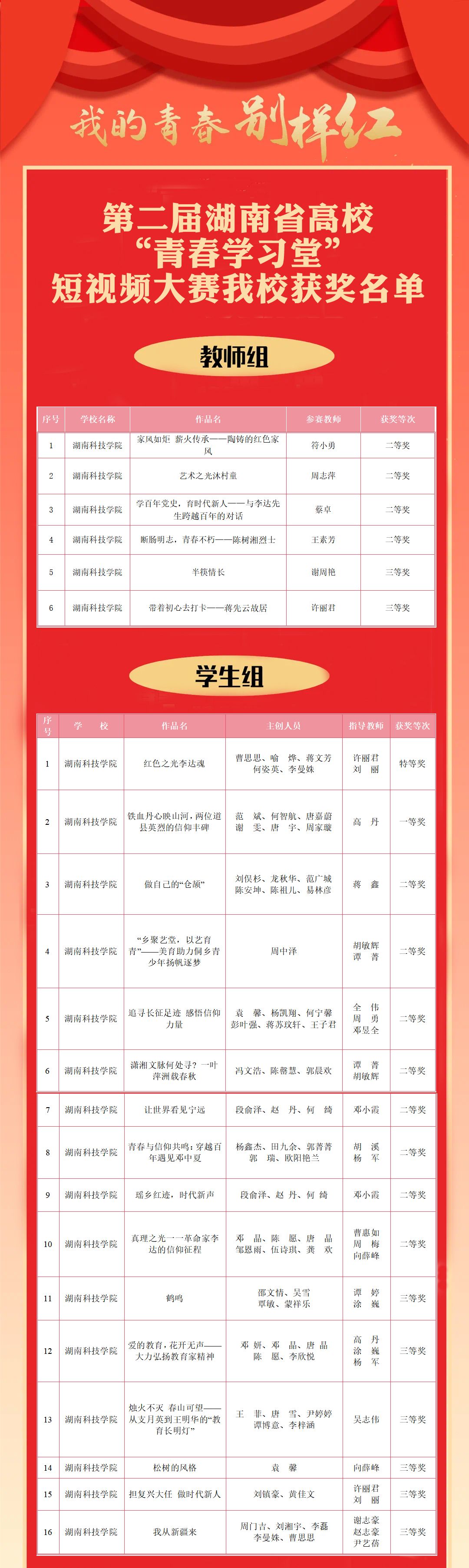 本网讯(记者 孙淑娴)近日,由中共湖南省委教育工委、湖南省教育厅、湖南日报社联合主办的湖南省第二届高校“青春学习堂”短视频大赛评选结果揭晓。世界杯官网师生在赛事中表现优异,斩获特等奖1项、一等奖1项、二等奖12项、三等奖8项,并荣获“优秀组织奖”,充分展现了学校扎实推进思政教育的阶段性成果。