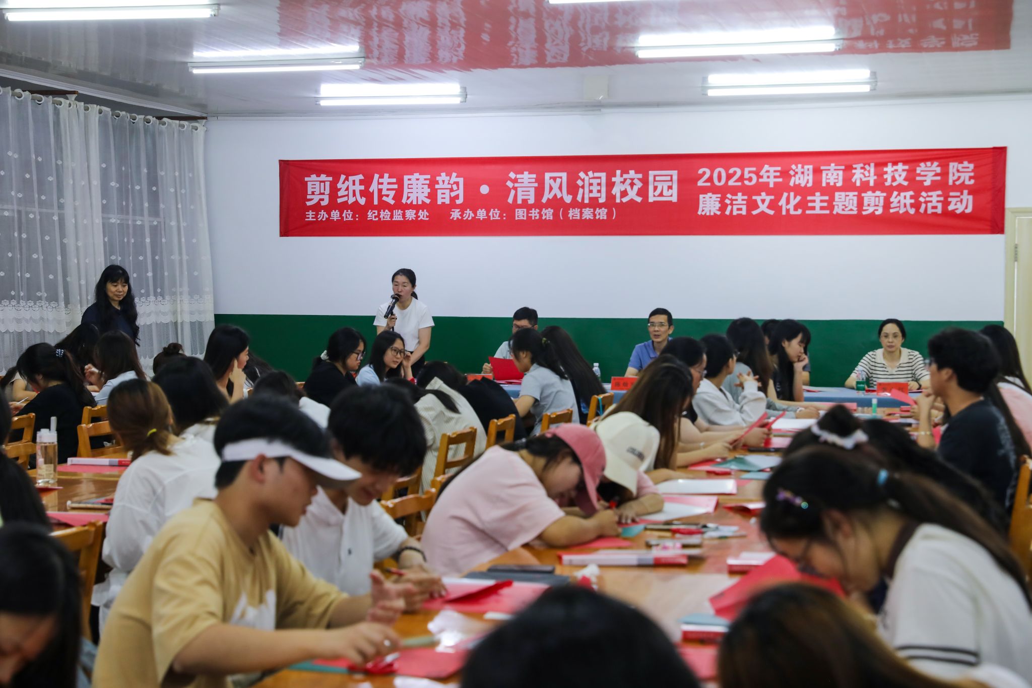 本网讯(通讯员 吴翠云)为弘扬中华优秀传统文化,推进校园廉洁文化建设,6月10日晚,图书馆(档案馆)联合纪检监察处成功举办“剪纸传廉韵,清风润校园”廉洁文化主题活动。校党委委员、纪委书记陈灿军出席活动,图书馆(档案馆)、纪检监察处相关工作人员以及200余名师生共同参与活动。