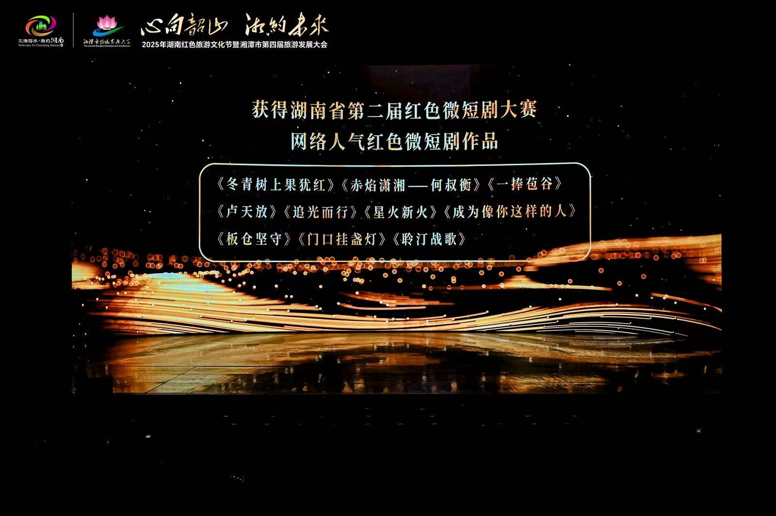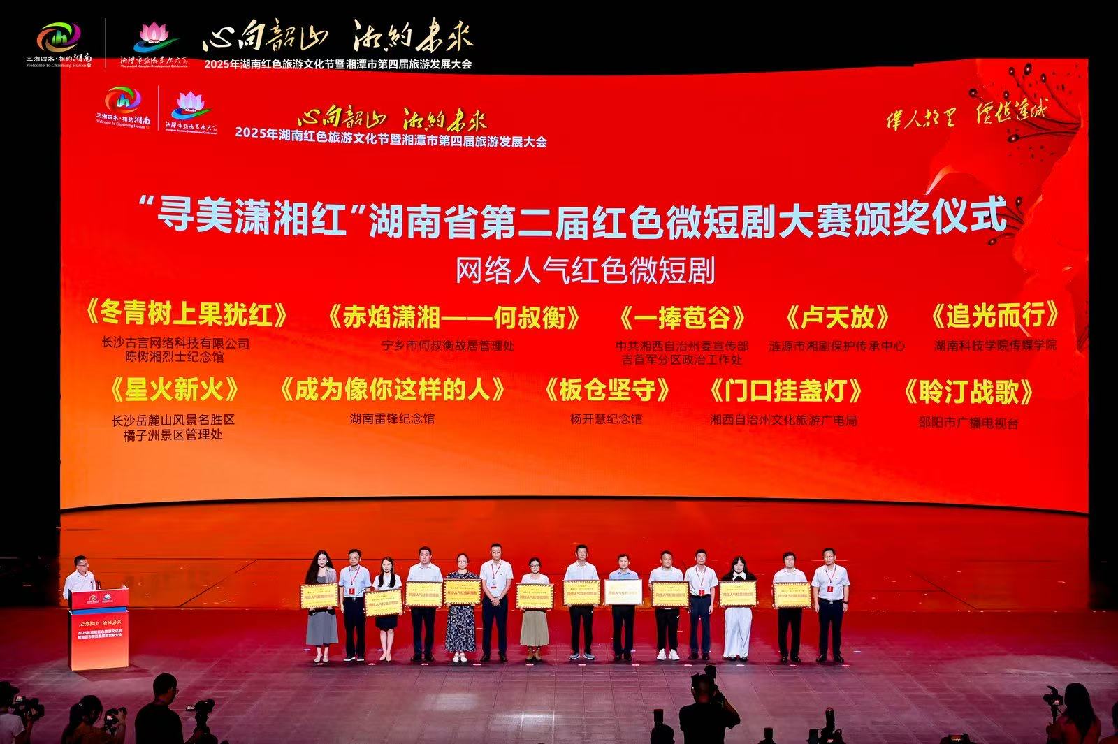 本网讯(通讯员 喻烨)7月11日,2025年湖南红色旅游文化节暨湘潭市第四届旅游发展大会在伟人故里韶山盛大开幕。开幕式上,“寻美潇湘红”湖南省第二届红色微短剧大赛颁奖仪式备受瞩目。世界杯官网传媒学院2022级学生曹思思、喻烨、何姿英、李曼姝、蒋文芳创作的作品《追光而行》荣获“网络人气红色微短剧”奖,成为全省唯一高校获奖作品。
