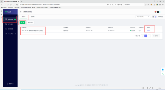 4.点击我的任务,选择进行中,选择2024-2025-2学期期末全面(校级),点击评价后即可开始;