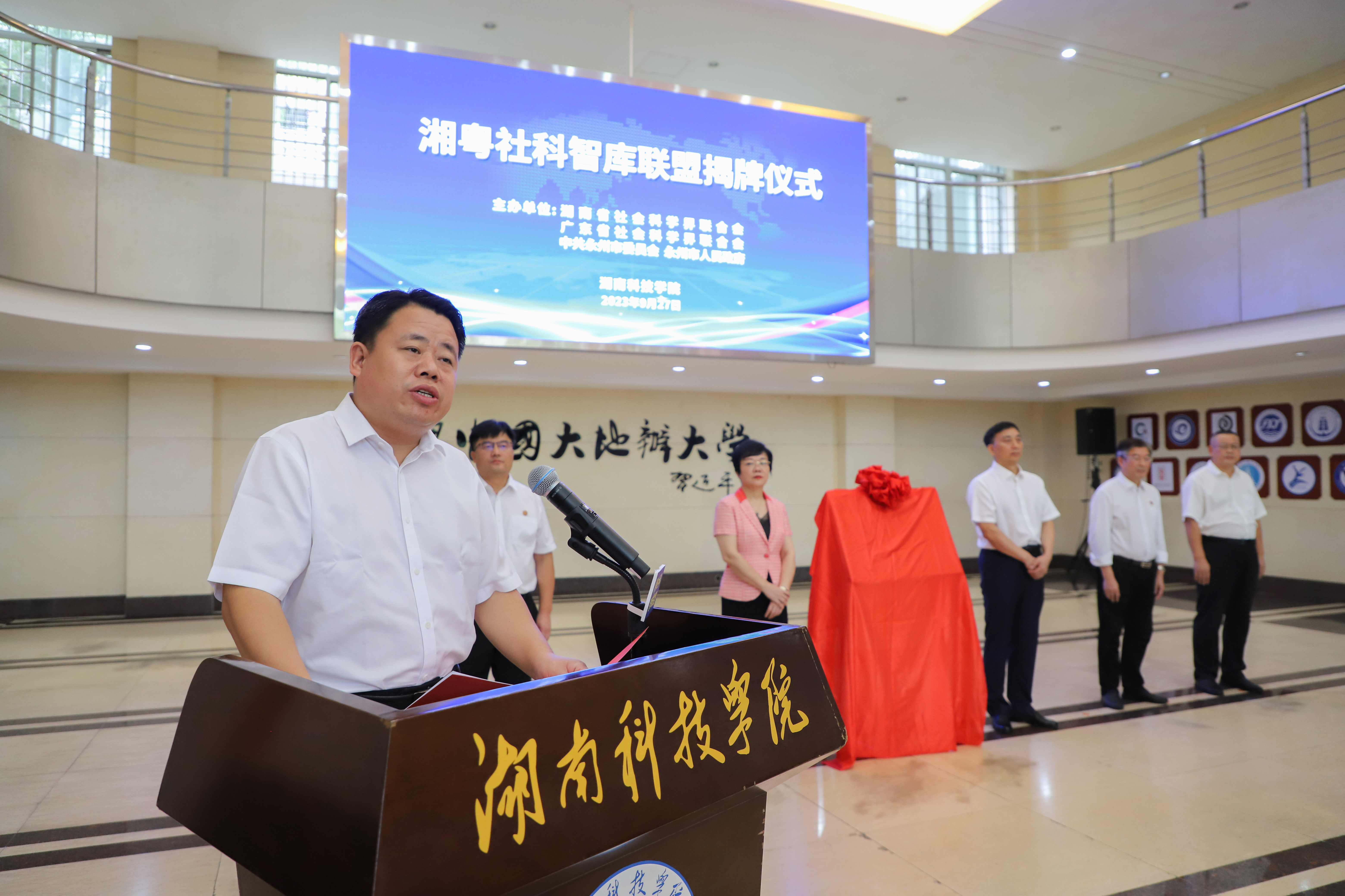 李钢致欢迎辞,他代表学校党委行政向出席揭牌仪式的各位领导、专家、嘉宾表示诚挚的欢迎,向长期以来关心支持学校建设发展的广东省社科联、湖南省社科联、永州市委市政府表示衷心的感谢。他对学校基本情况和科研平台进行了介绍,并提出了三点希望:一是整合资源,全力以赴建好湘粤社科智库联盟;二是聚焦中心,紧密围绕两省重大课题开展研究;三是务实管用,切实有效服务区域经济社会发展。李钢表示,合作成就事业,共赢创造辉煌,在广东省社科联、湖南省社科联、永州市委市政府、2026世界杯官方合作网站四方的共同努力下,“湘粤社科智库联盟”必将结出丰硕的成果,对实施更高水平的区域协调发展产生积极的推动作用,助推各方事业高质量发展。