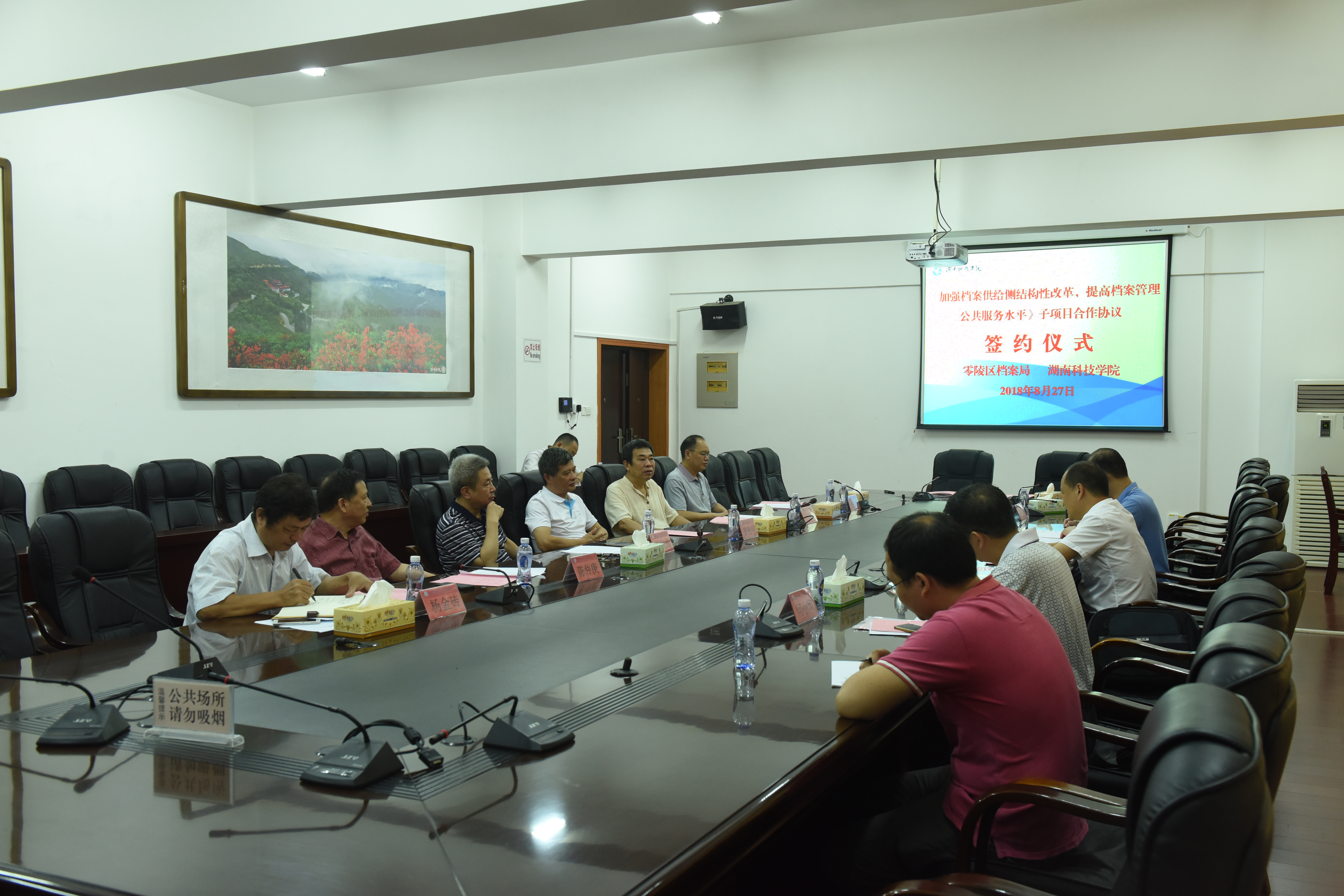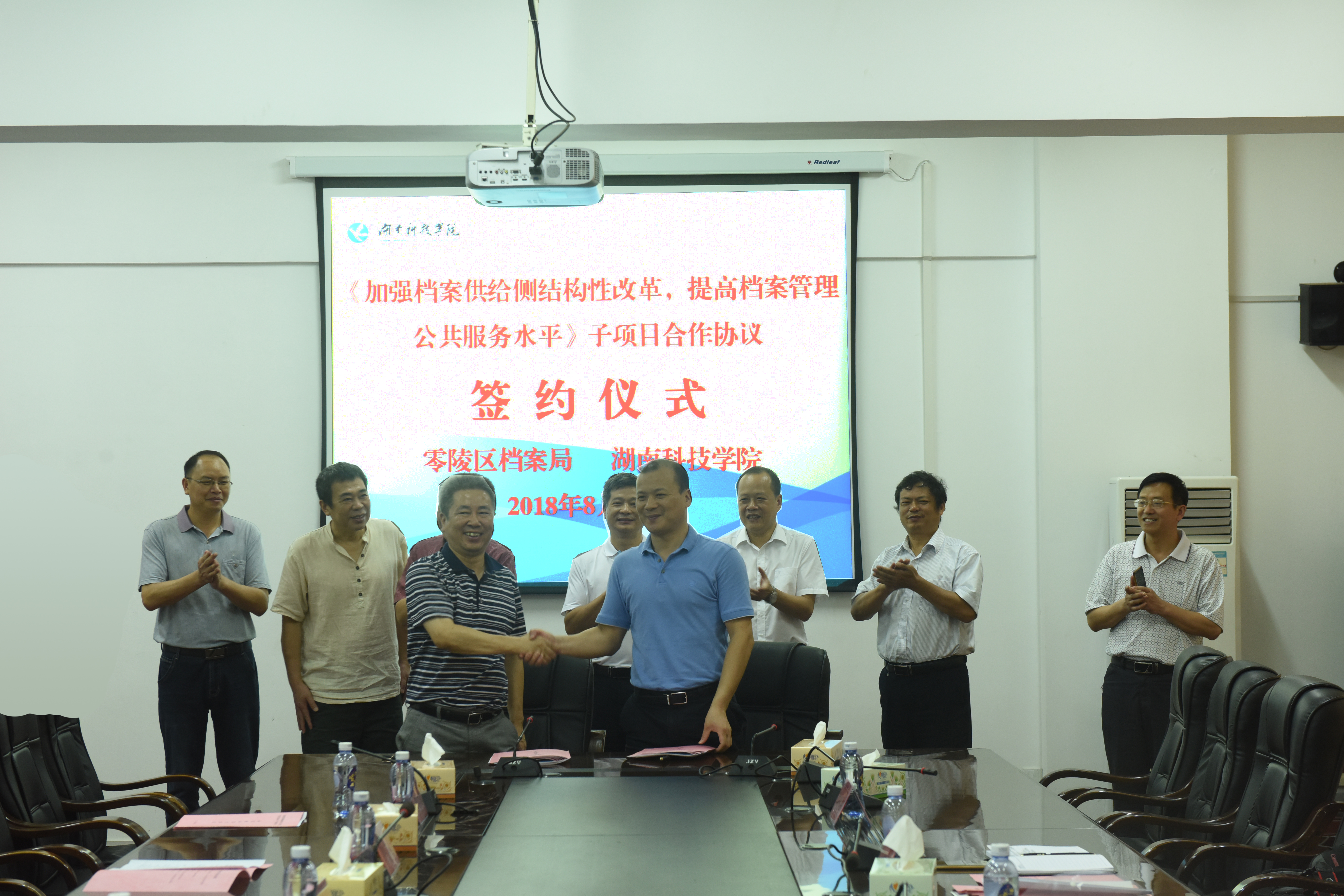 本网讯 8月27日上午,世界杯官网与零陵区档案局合作签约仪式在行政楼6楼会议室举行,双方就《加强档案供给侧结构性改革,提高档案管理公共服务水平》的3个子项目的合作展开深入探讨并签订合作协议,合作研究经费共计60万元。零陵区委常委、区委办主任彭江辉,零陵区档案局局长王增荣及有关负责同志,校长曾宝成、校党委副书记唐艳明、各子项目负责人及有关研究人员参加签约仪式,仪式由王增荣主持。