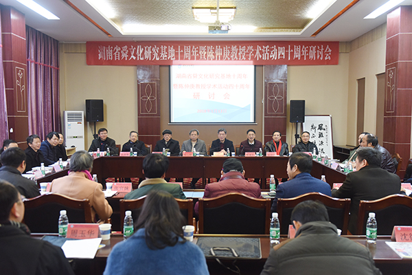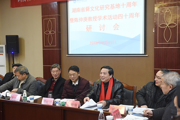 本网讯    1月13日上午,由湖南省文联文艺创作与研究中心、湖南省舜文化研究基地、永州市文艺评论家协会、永州市舜文化研究会主办的湖南省舜文化研究基地十周年暨陈仲庚教授学术活动四十周年研讨会在校举行。副校长宋宏福、郑山明以及来自省、市文学、评论、学术界的胡宗健、张泽槐、李长廷、蔡建军、王涘海、杨金砖、魏剑美、夏昕、吴茂盛、刘翼平等著名作家、专家、学者50多人出席。研讨会由永州市舜帝文化研究会会长潘雁飞教授主持。