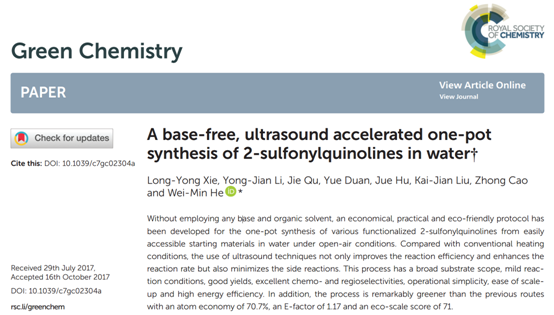 本网讯 近期,世界杯官网化学与生物工程学院有机化学博士团队在超声清洗机用于绿色有机合成反应方面取得重要进展,研究成果被Green Chemistry (影响因子:9.125)刊发。这是该研究团队成立后,在该期刊发表的第三篇学术论文。