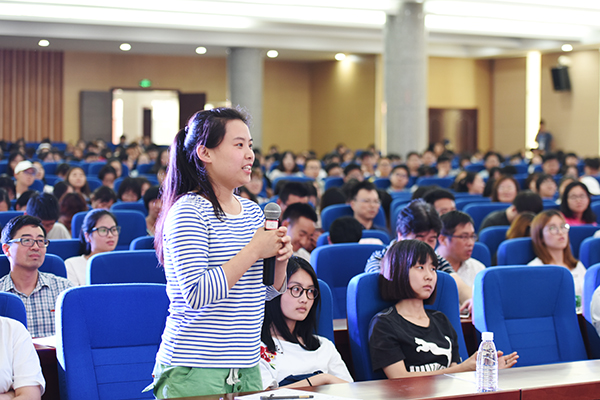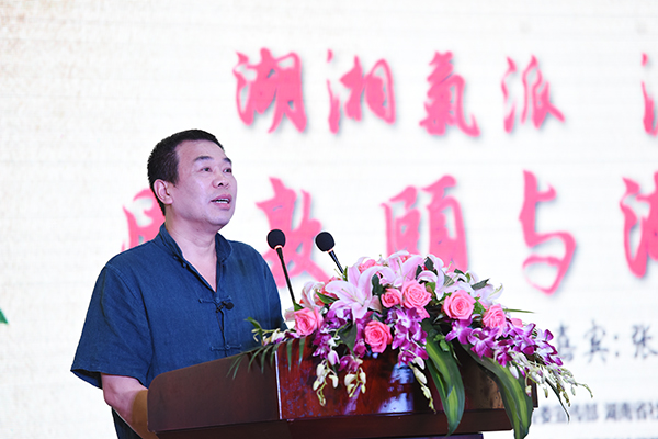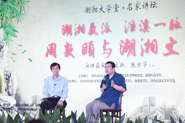 而随后演讲的张京华教授,主要谈论的是对周敦颐思想的理解和感悟。他同样提及了著名的《爱莲说》,却另辟蹊径,以“周茂叔窗前草不除”的典故说明周敦颐以万物为一体的“仁”的思想。周敦颐虽然以莲花自喻,但也尊重牡丹与菊花的存在,甚至连窗前碍事的杂草也不忍除去,由此周敦颐是一个泛爱万物的圣人。随后,张京华教授又从纯哲学的角度谈论了周敦颐的名篇《太极图说》。他生动论述了濂溪思想千年来对湖南思想文化的重大影响,劝勉在座学子,生长在濂溪故里,更应该努力学习濂溪思想,弘扬濂溪哲学。