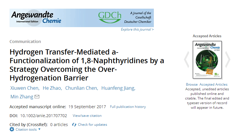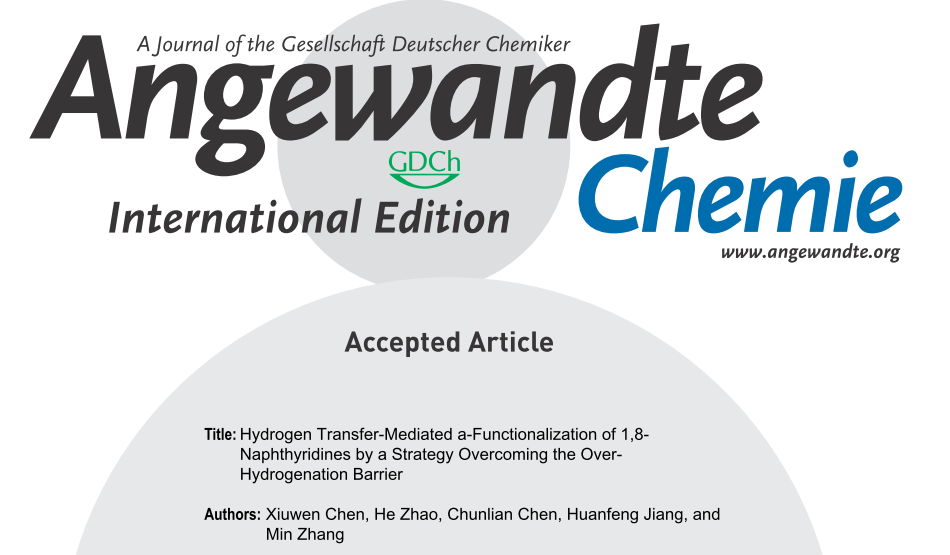 本网讯 近日,世界杯官网化学与生物工程学院陈修文博士以第一作者身份,在化学领域顶级期刊Angewandte Chemie(影响因子:11.994)上在线发表专题论文《Hydrogen Transfer-Mediated -Functionalization of 1,8-Naphthyrid- ines by a Strategy Overcoming the Over-Hydrogenation Barrier》。