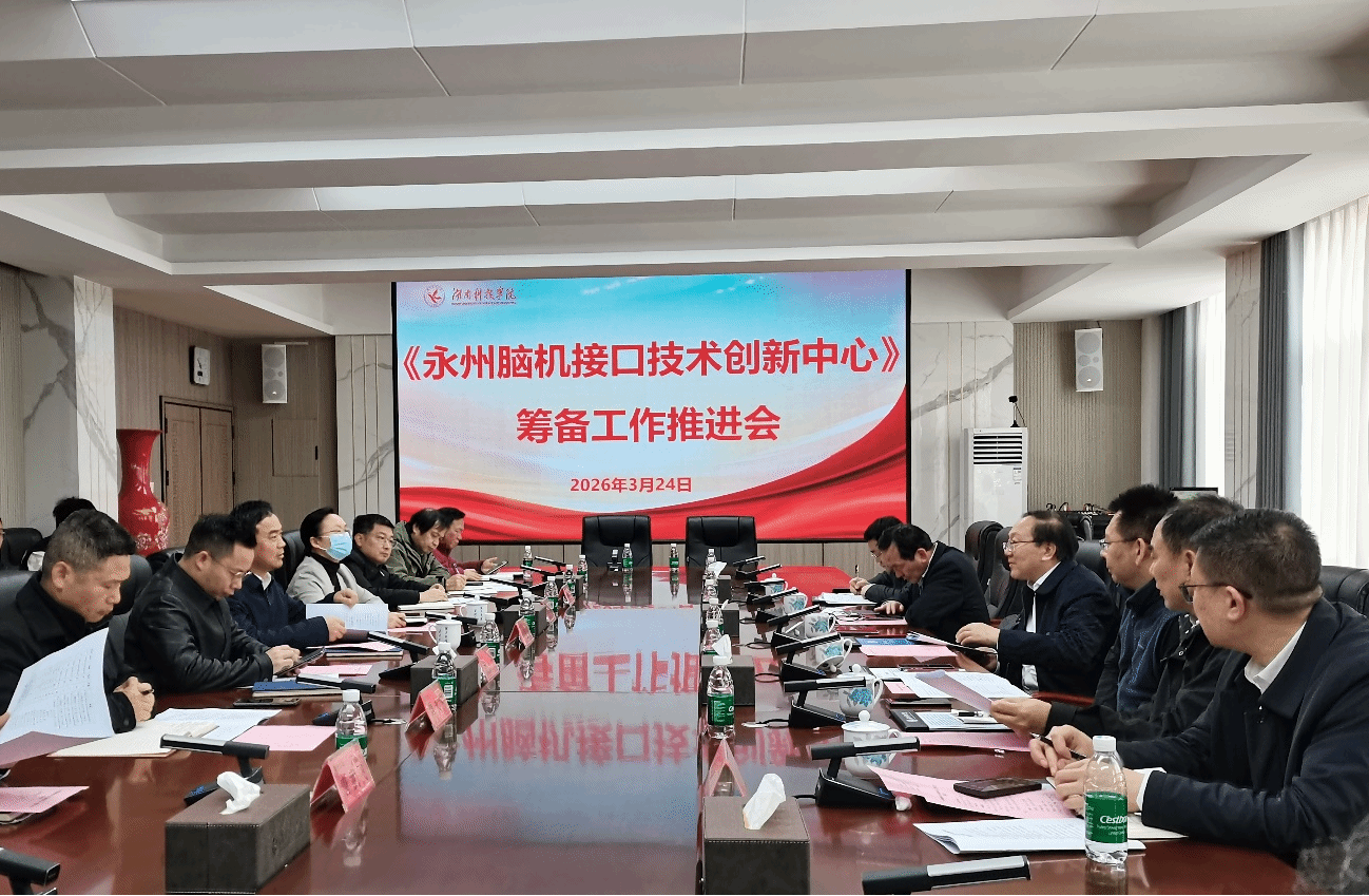 信息工程学院院长尹向东汇报了永州脑机接口技术创新中心的整体筹备情况,系统介绍了中心的建设背景、战略规划与核心目标。教师代表黄堂森博士进一步汇报了“非侵入式EEG脑电信号智能解码与具身交互”研究计划。各理工科学院负责人还围绕脑机接口技术方向等进行了深入研讨。
