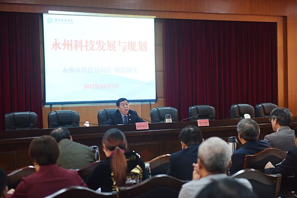 报告会上,欧阳树生以“永州科技发展与规划”为主题,结合十九大报告中有关科技发展的系列重要精神,从科技是第一生产力、自主创新、创新驱动发展、科技发展的国际意义、本省市科技发展成果等方面深入透彻地介绍了科技发展的重要性。他向大家展示了近年本省市科技发展的优秀成果,并根据自主创新从“科学、秩序、创新”三个方面阐释了科技发展的方向,指出地方院校和科技人员要发挥引领作用,为科技发展提供人力支撑和智力支持。