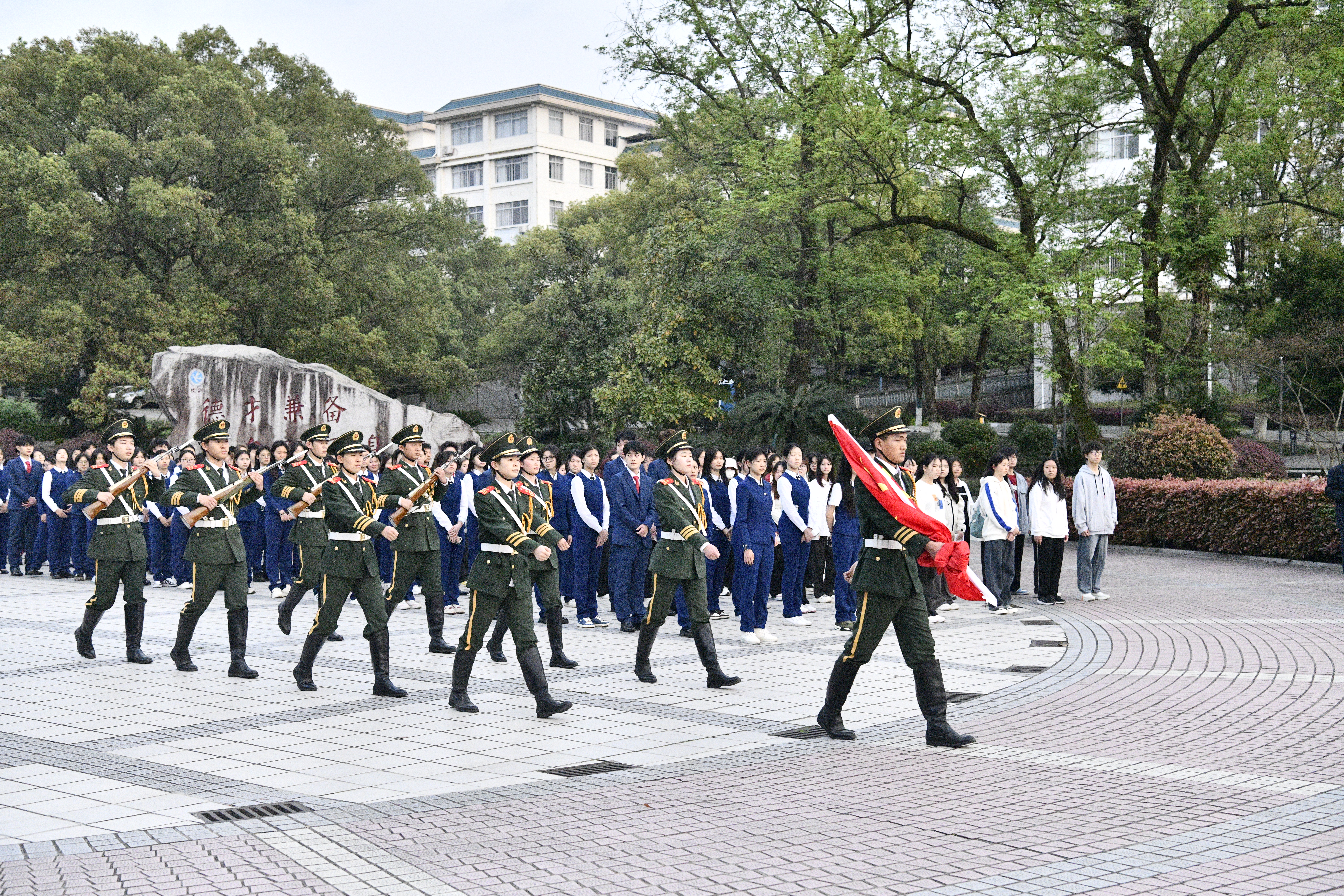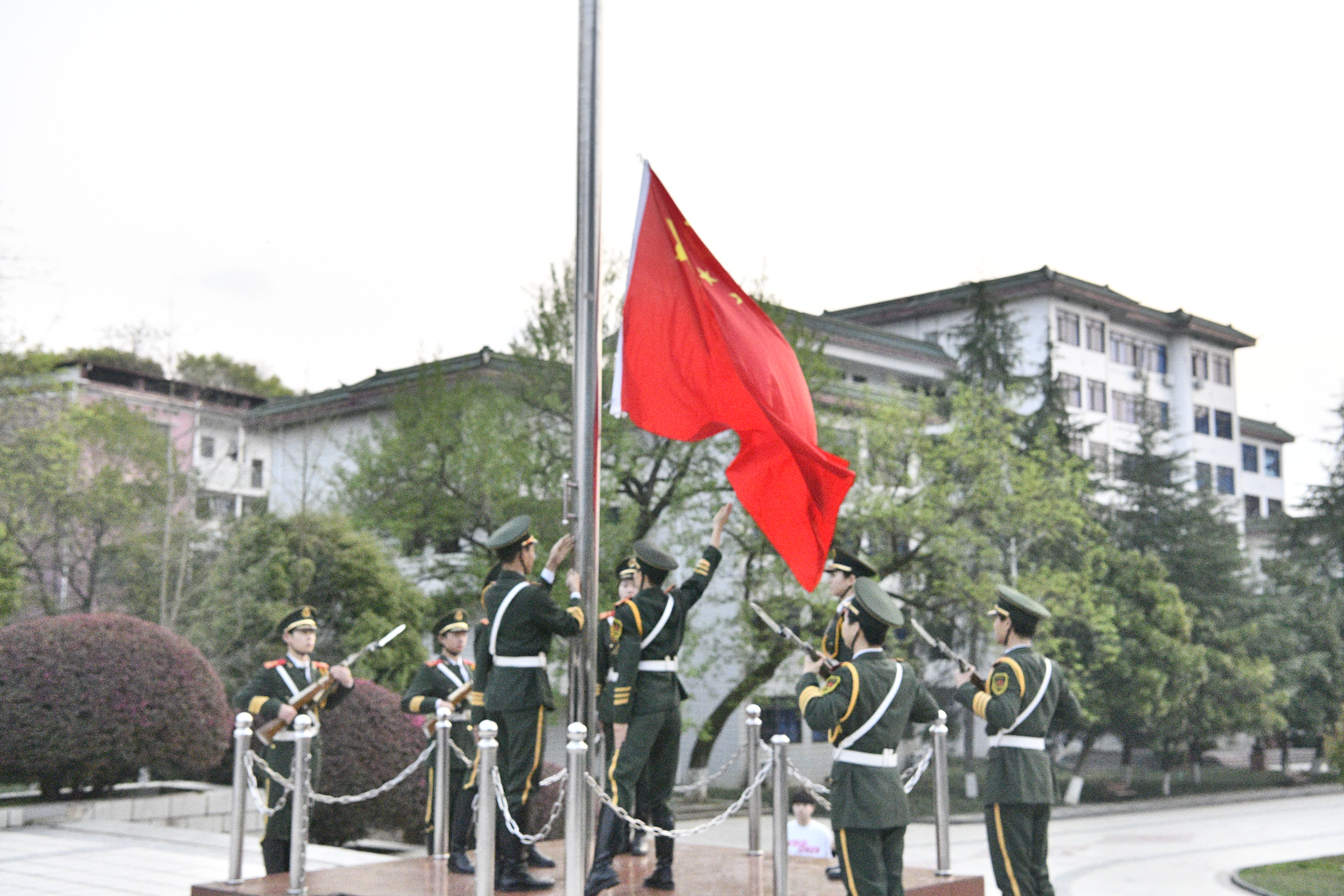 清晨的微风中,国旗护卫队的成员们迈着坚定的步伐,护送着五星红旗走向升旗台。伴随着雄壮的国歌声,鲜艳的五星红旗冉冉升起,迎风飘扬。全院师生整齐列队,肃立注目,共同见证这一庄严时刻。