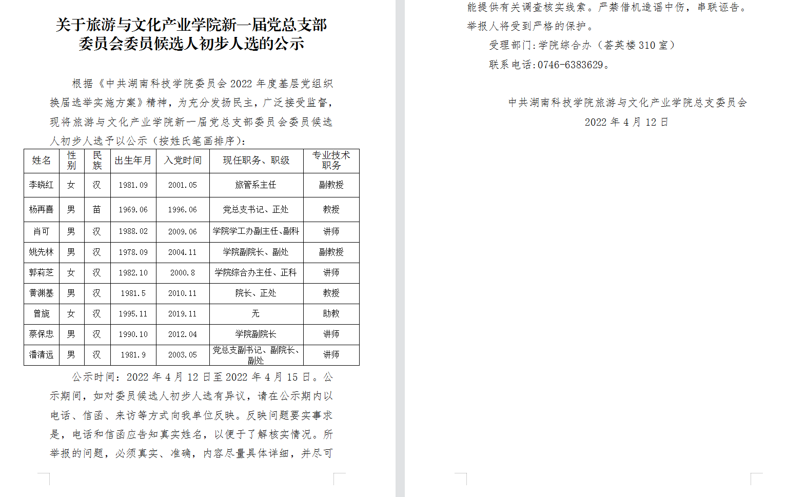 关于旅游与文化产业学院新一届党支部委员会委员候选人初步人选的公示