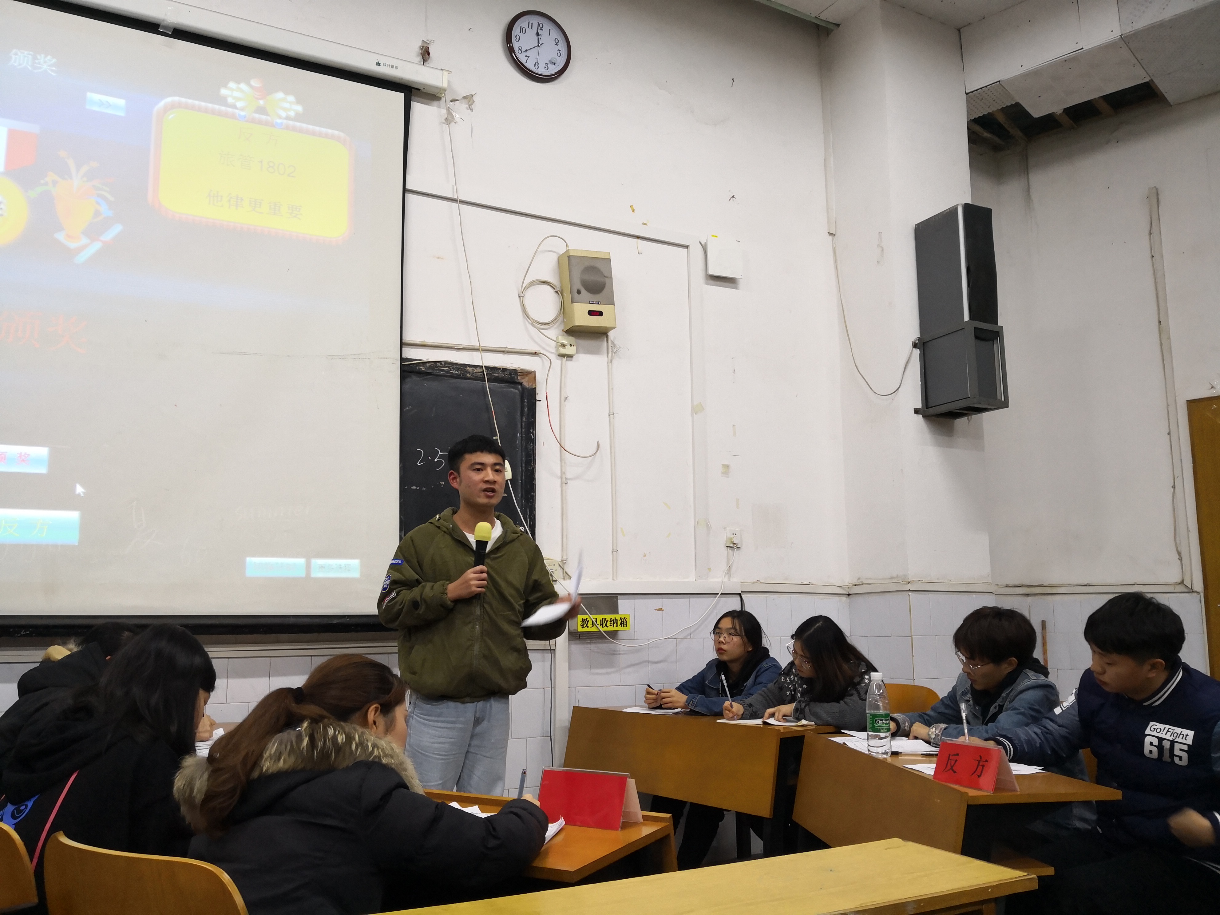 本次比赛由正方1801班和反方1802班就“他律和自律谁更重要?”展开辩论。双方针锋相对、步步紧逼,现场气氛热烈。双方辩手清晰的思路和巧妙的陈词给评委和观众留下了深刻印象。最终,反方获得了辩论赛的胜利。