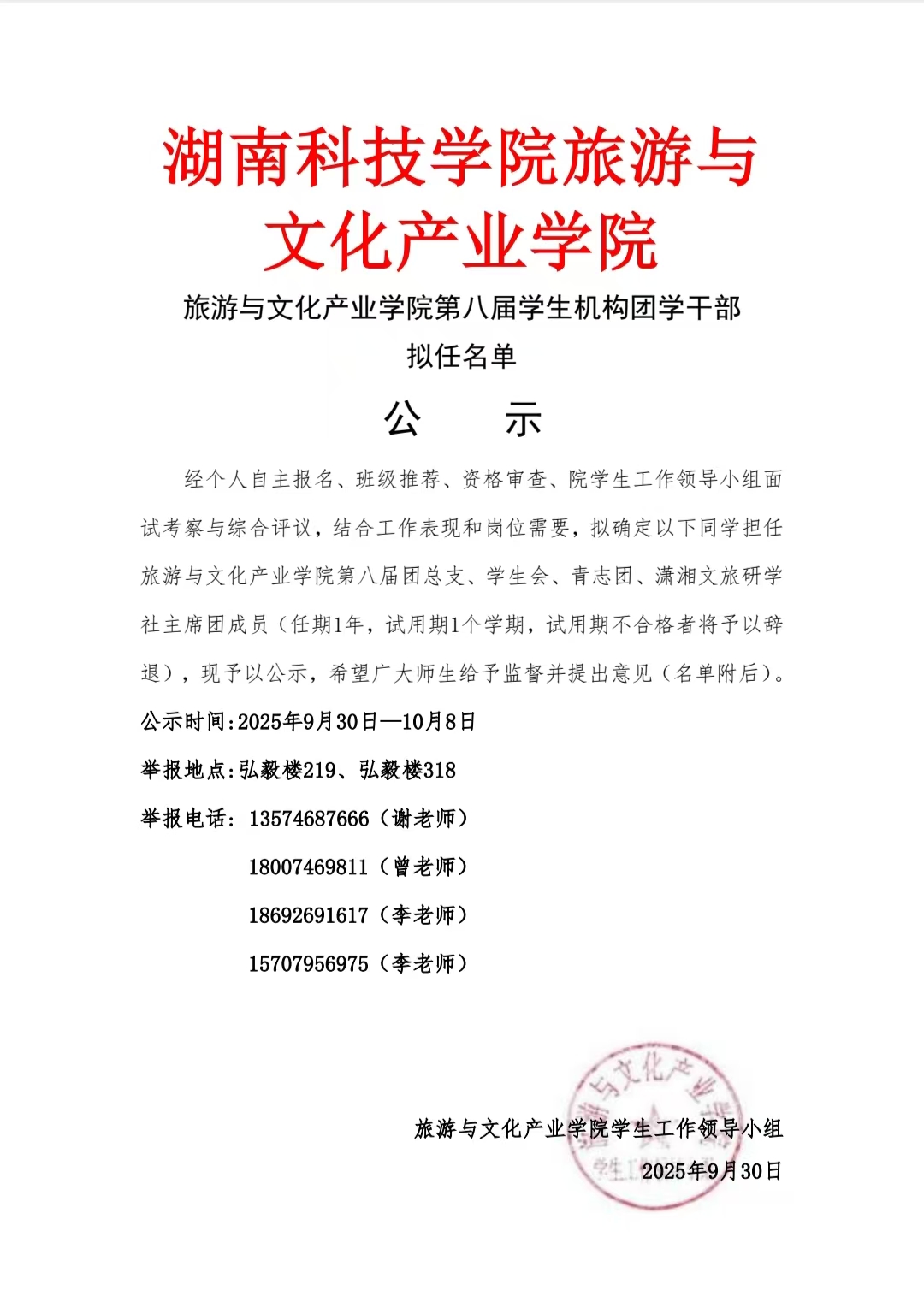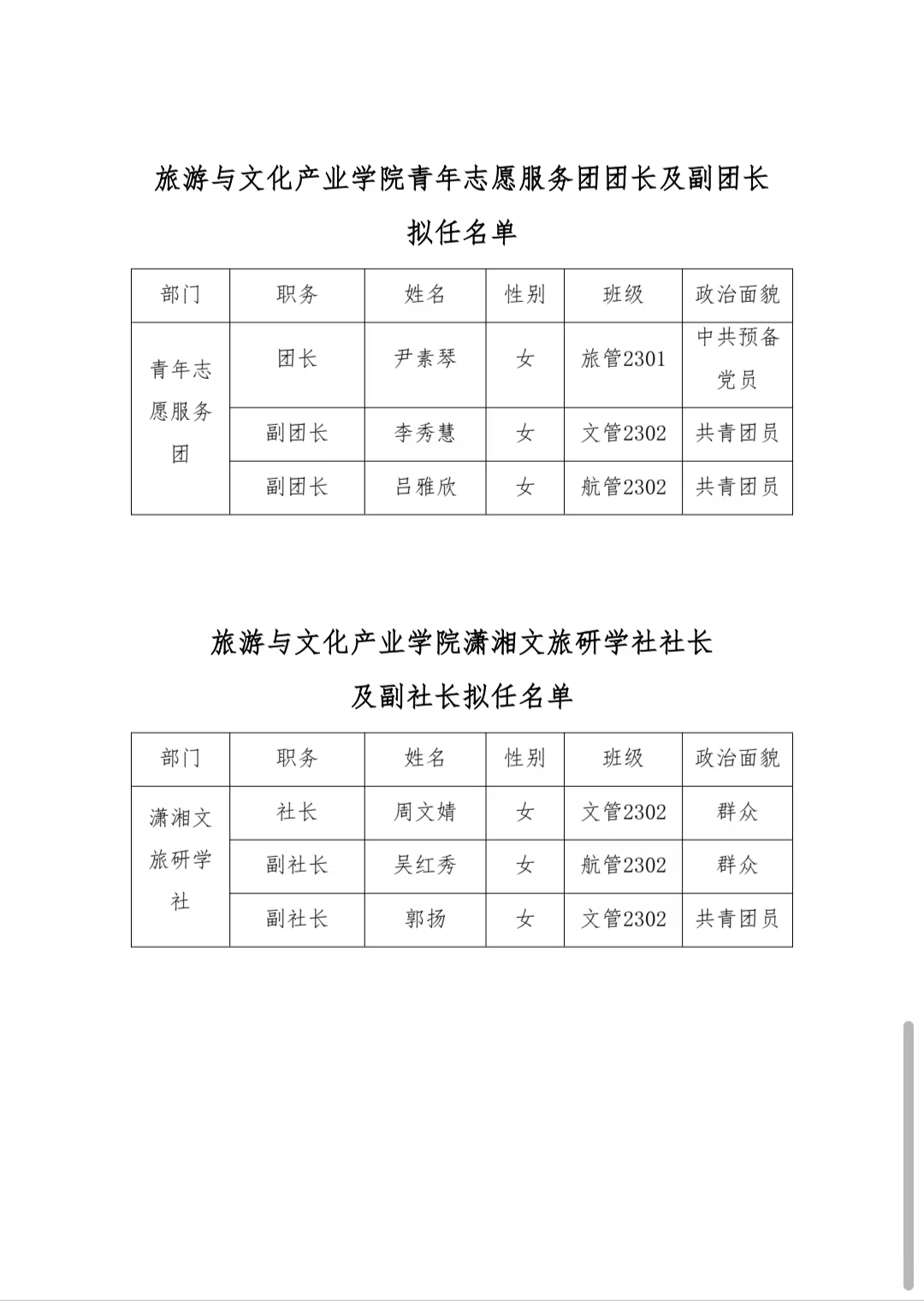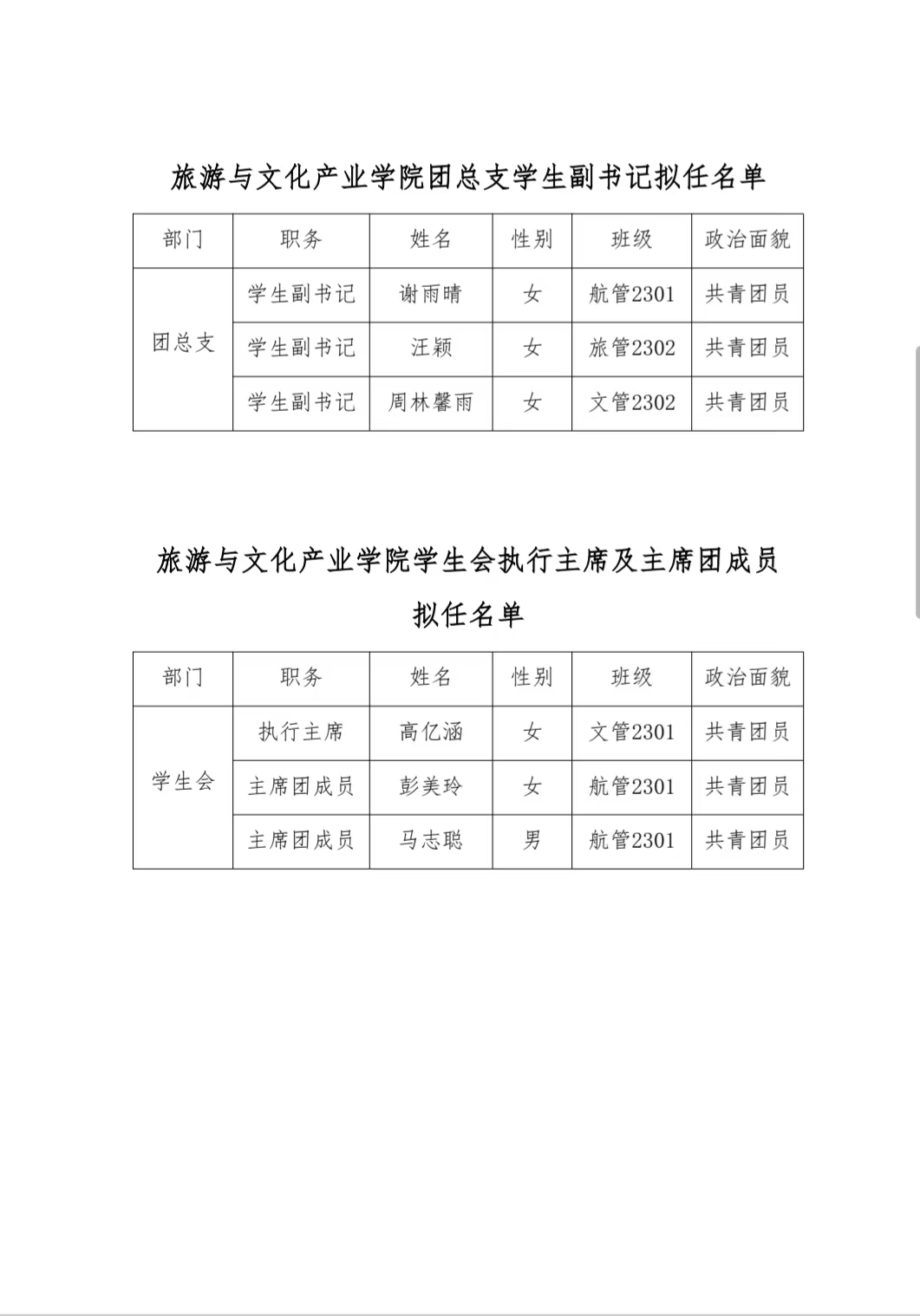 旅游与文化产业学院第八届学生机构团学干部拟任名单公示