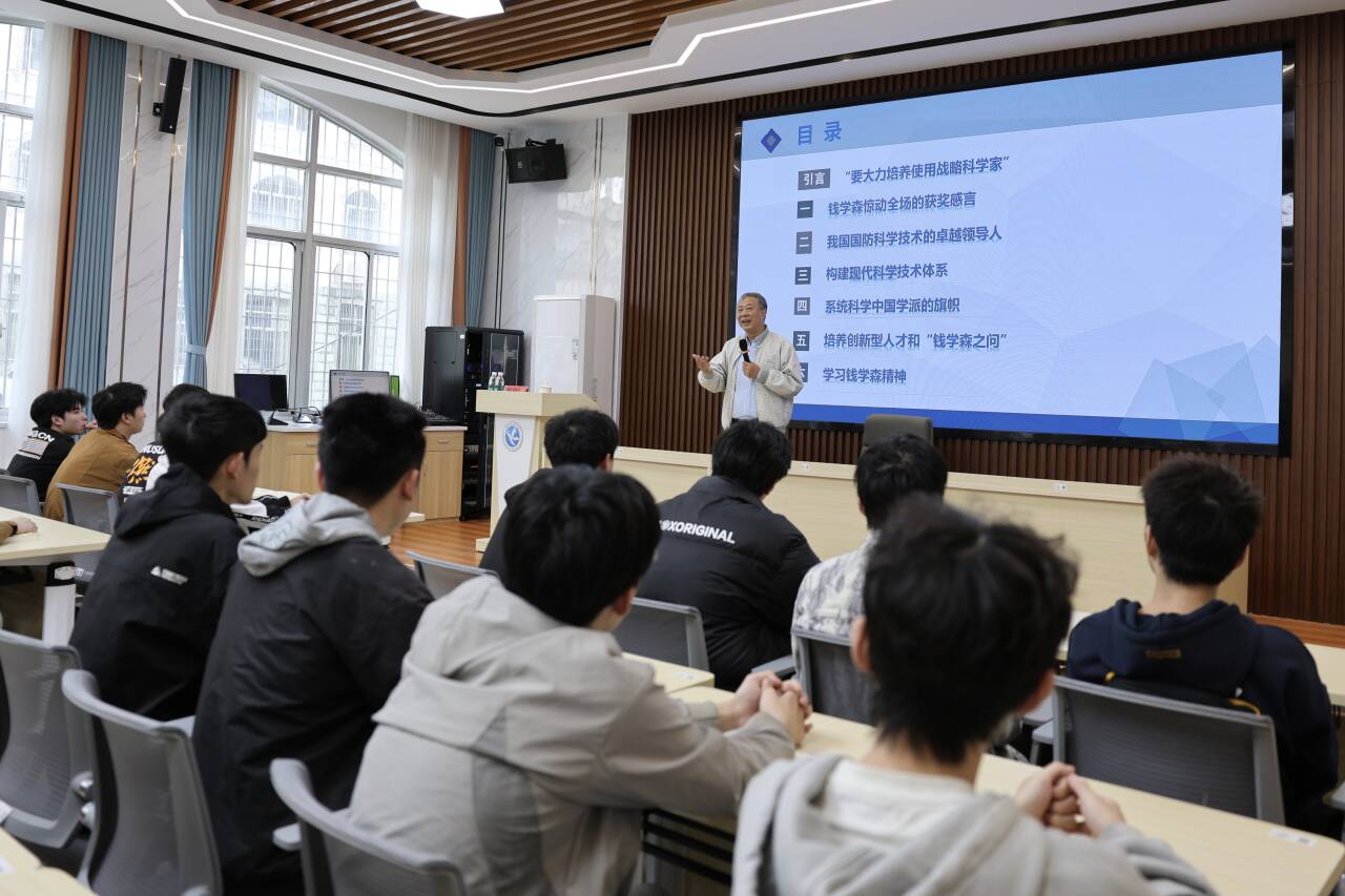 讲座中,陈建新教授结合多年研究与调研经历,围绕钱学森先生的生平事迹、科研贡献与精神风范展开分享,生动讲述其归国投身国防科技事业的故事,深入解读“钱学森之问”的时代内涵,将科学家精神、科技强国理念融入课堂,让思政教育与专业教育深度融合。互动环节,同学们就学业规划、科研成长等问题积极提问,陈建新教授耐心解答并给出切实指导建议,现场氛围热烈,同学们纷纷表示收获颇丰。陈建新教授最后总结,希望同学们以钱学森先生为榜样,涵养家国情怀,在专业学习中夯实基础、勇于探索,将个人成长与国家发展紧密结合,以所学助力国家科技发展。