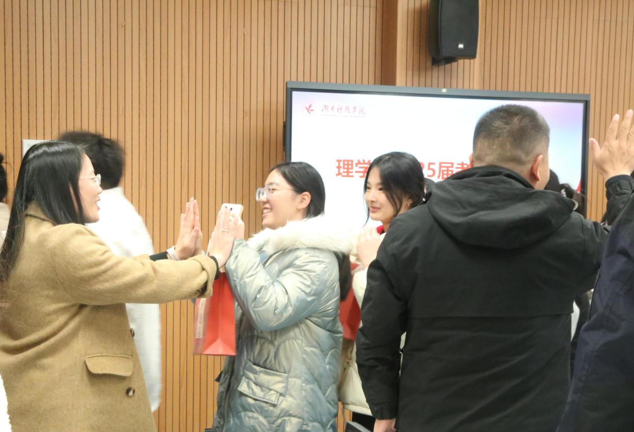 加油会在由学弟学妹们制作的考研加油视频播放中拉开序幕,紧接着,理学院院长李小武致辞,他分享了自身考博经历,以此鼓舞同学们的士气。针对目前就业环境,李小武院士强调了考研对于个人学术发展和职业规划的重要性。他鼓励学生们要明确目标,坚持不懈。接着,党总支书记刘华发表了讲话,她鼓励同学们要坚定信念,克服困难。她还提醒大家合理安排复习计划,保持良好的身心状态。由学院领导老师将考研加油礼物发放给每一位考研学子与他们击掌为誓,祝福他们一站成“硕”,成功上岸。