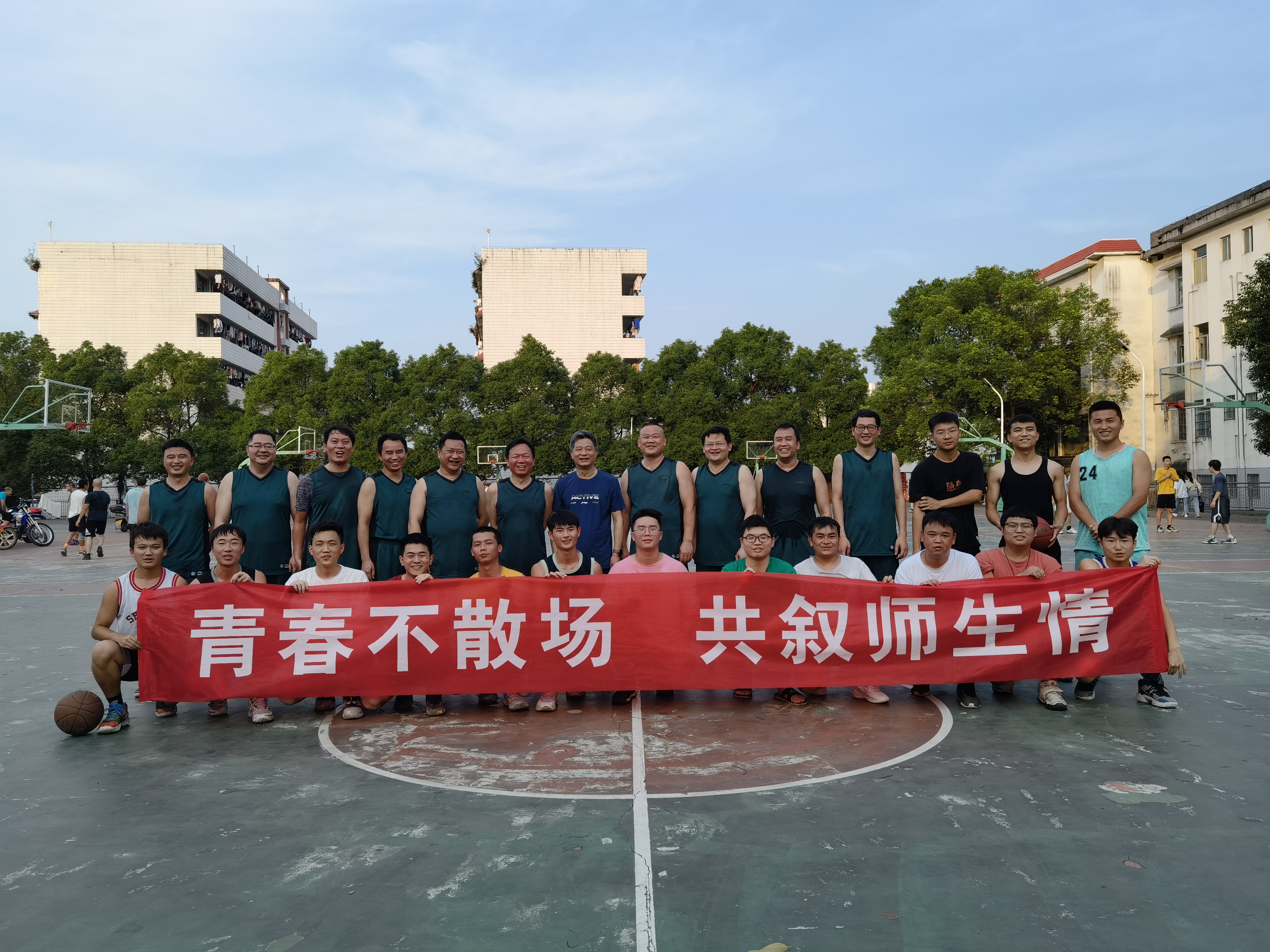 赛前,学院篮球队与毕业生合影留念,整个比赛在轻松、友好、欢快的节奏中进行,最后毕业生联队以微弱的优势获胜。比赛结束后,学院院长唐耀平鼓励毕业班学生要把比赛中表现出的进取、拼搏、团结的竞技精神带到以后的工作和生活中去,离开理学院,人生路上依旧逐梦芳华,青春不散场!