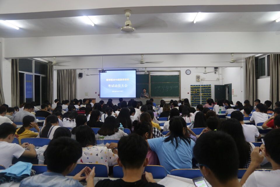 本网讯(通讯员谢娟李妍蝶)9月18日晚,理学院于明理楼402教室举行教师资格证迎考学生动员大会。理学院院长唐耀平、党总支书记陈旭日、党总支副书记唐卫华、16级辅导员刘铮以及16级全体师范生参加了此次动员大会。