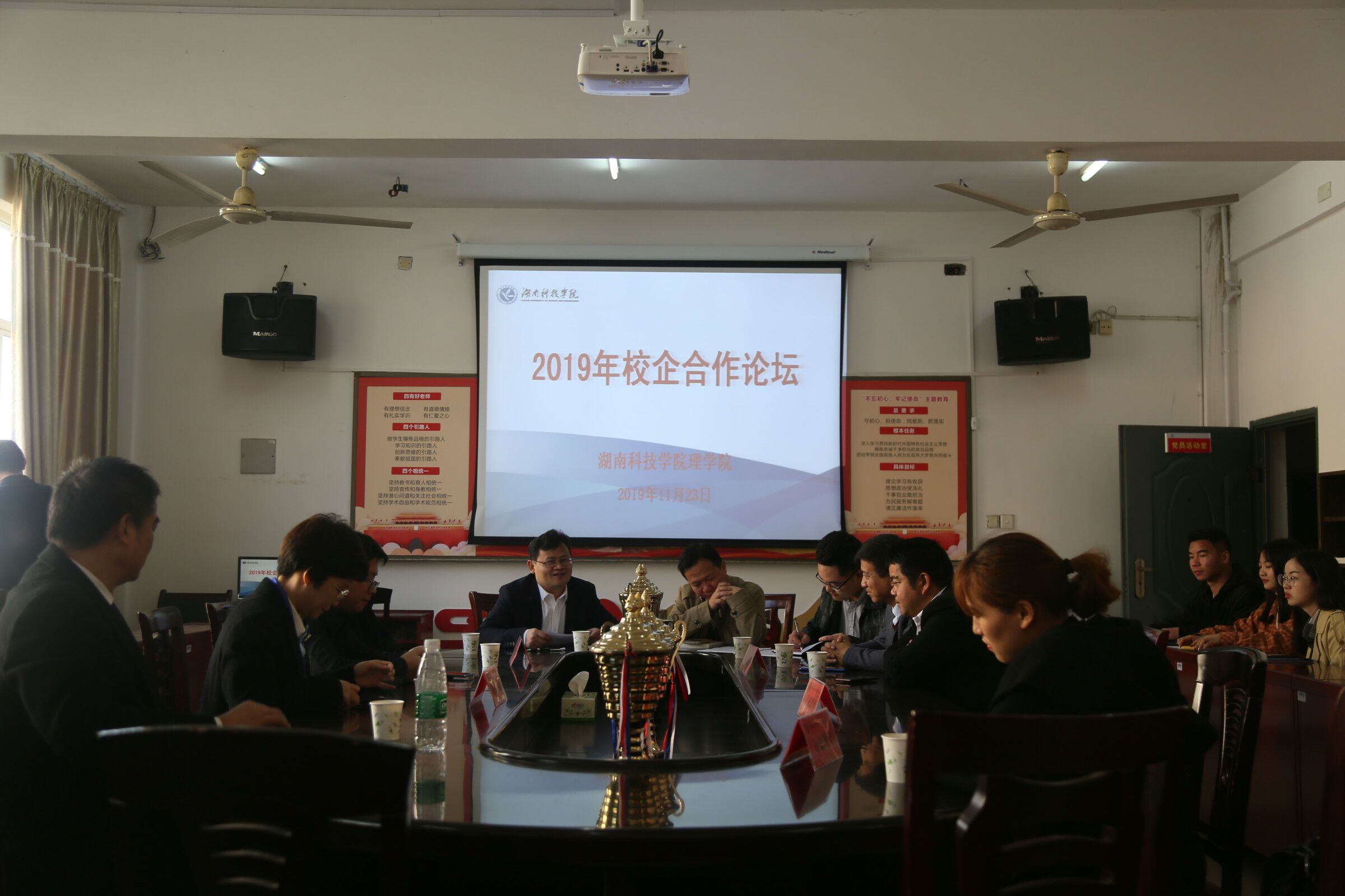 本网讯(通讯员 彭云先 杜俊杰)11月23日上午,由理学院举办的2019年校企合作论坛在明理楼308召开。来自陶铸中学、零陵君诚实验学校、东安天诚实验学校、永州天成教育、永州市行健文化教育培训学校的13名企业代表参加论坛。论坛由学院党总支书记唐卫华主持。