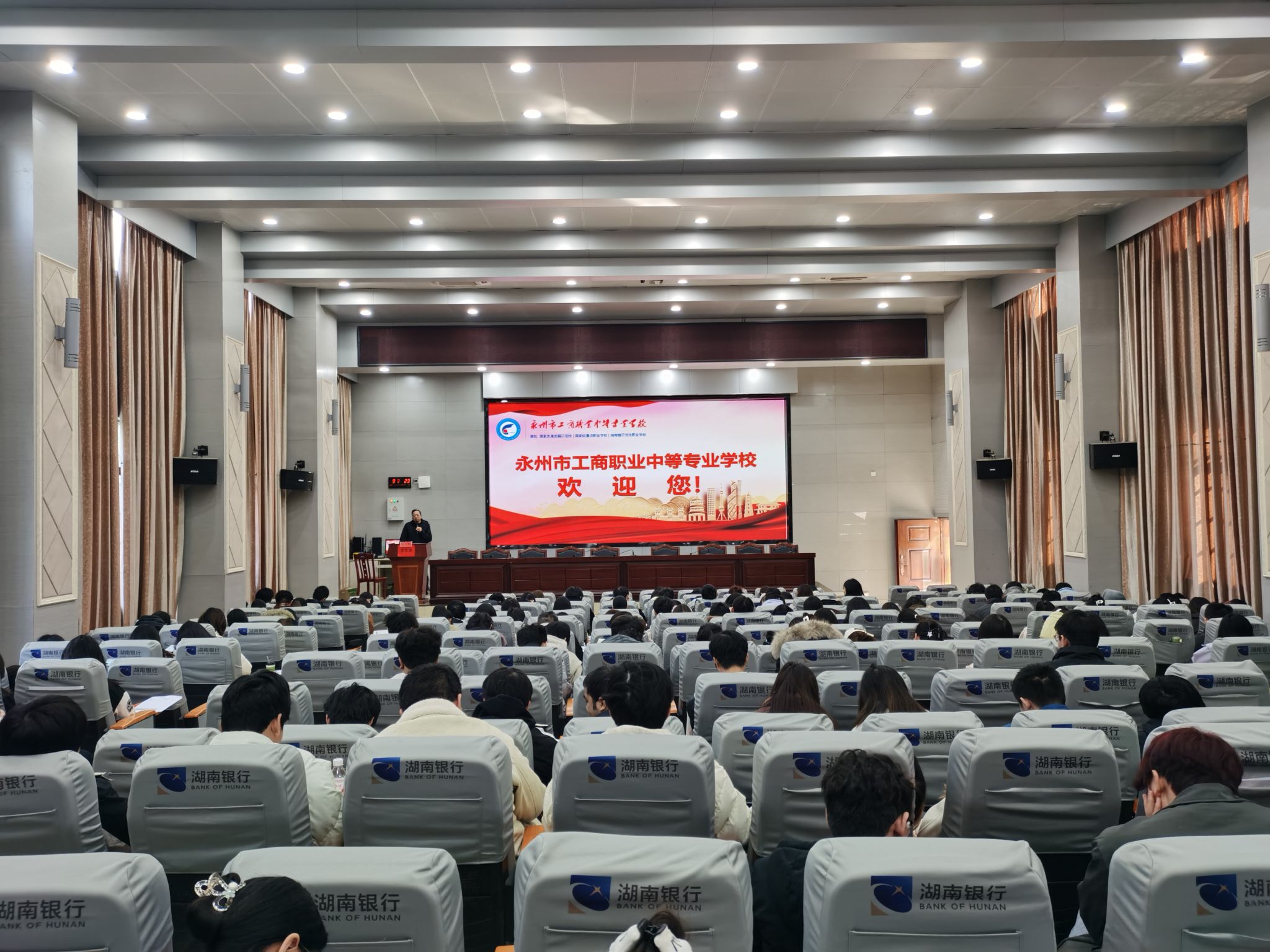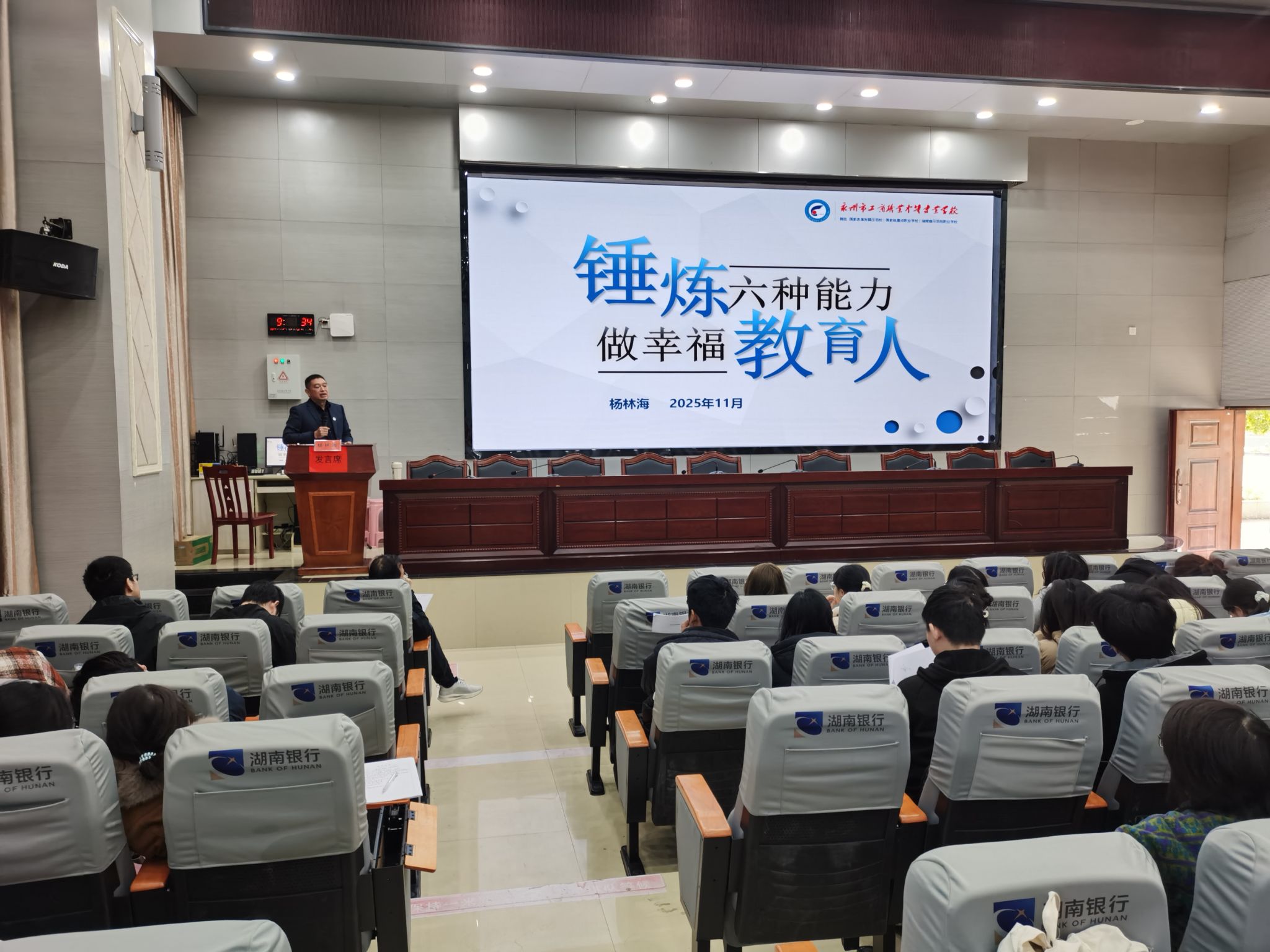 11月27日,我院师范生见习工作在永州市工商职业中等专业学校进行,本次见习工作由见习组组长周宇剑老师带队。。永州市工商职业中等专业学校杨林海书记和眭光明主任进行讲座,杨林海书记开展讲座为《锤炼六种能力,做幸福教育人》,主要从优秀教师的六种能力(扎实的专业知识、独特的教学风格、出色的教学方法、良好的教学组织、高效的教学质量、鲜明的教学特色)等六个方面进行阐述。眭光明主任主要从教师的日常工作进行了细致的分析和讲解,并对班主任工作和班级管理给出了切实可行的参考方案。