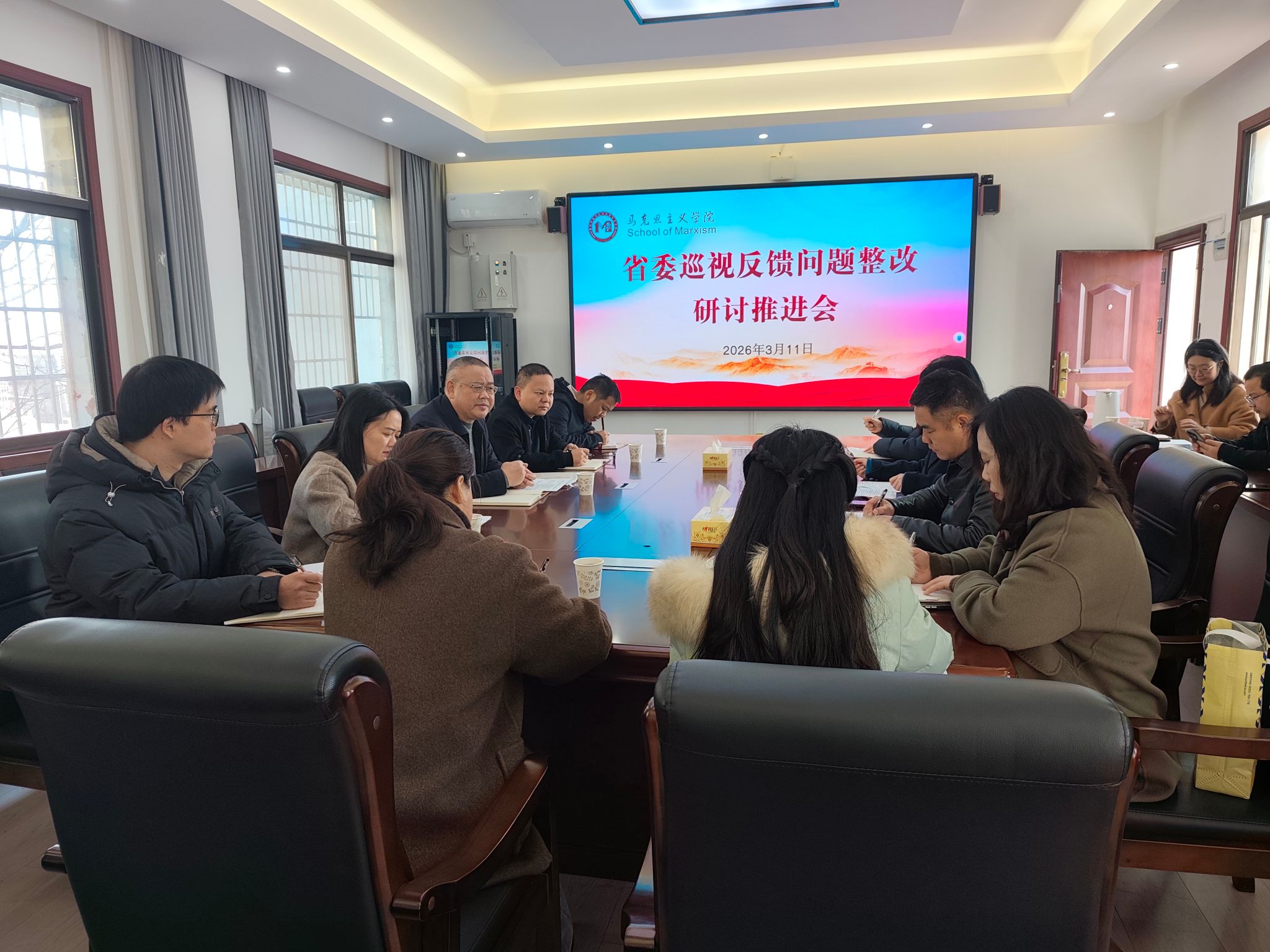 本网讯(通讯员 吴志伟)3月11日上午,马克思主义学院在鹤鸣楼405会议室召开省委巡视反馈问题整改研讨推进会,专题研究部署问题整改,推动整改工作走深走实、落地见效。学校党委委员、副校长何福林,学校教务处、教学质量管理处负责同志,学院党总支班子成员、三办主任、各教学部主任参加会议,会议由学院党总支书记高丹主持。