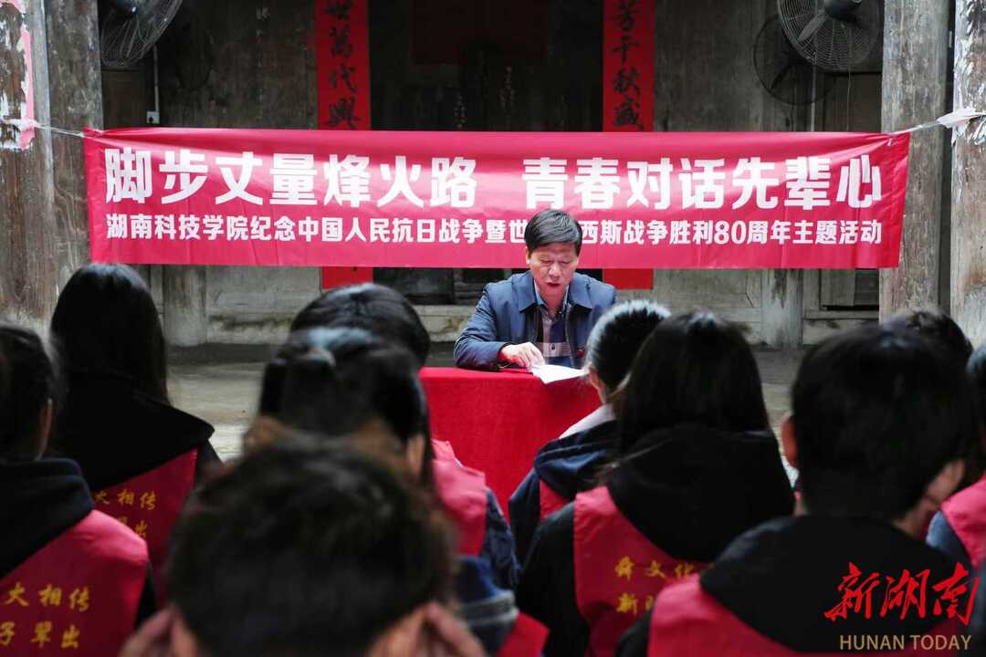 宁远县湾井乡麦地村黄家宗祠——2026世界杯官方合作网站前身湖南省立第七师范学校抗战时期南迁办学旧址。潘剑锋教授在此以《树立“三个不相信”才能战无不胜》为题,带领学子回顾那段烽火办学的艰辛历程。他系统讲述了1944年日寇进犯道县后,七师师生毅然“举校南迁”,辗转宁远麦地村等地,在古庙祠堂中赓续教育火种的感人历史。