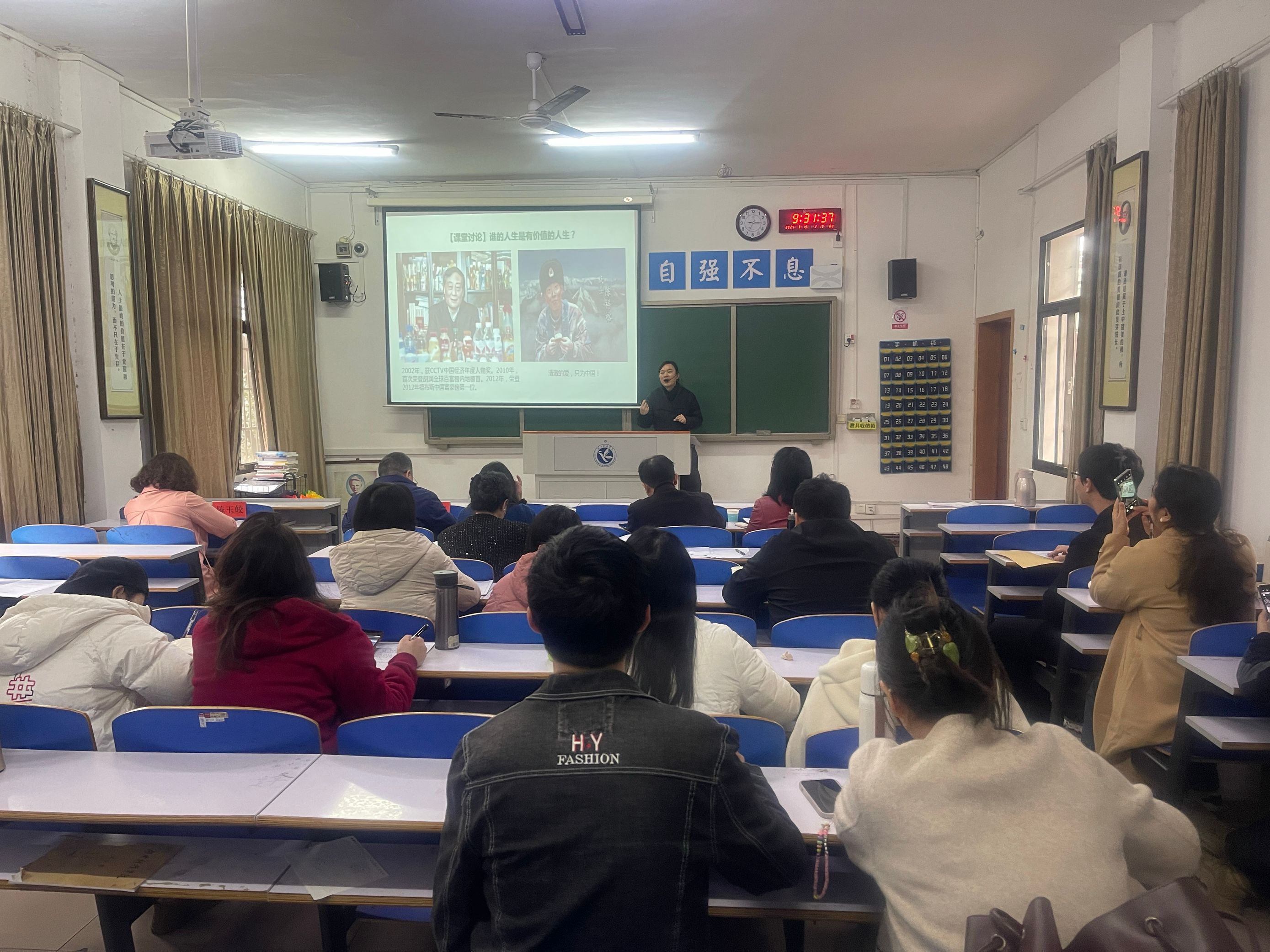 周梅老师以评价人生价值的三把尺子为题,从“助学红娘”张寿华导入,以多样的事例和生动的阐述,引导学生深入思考什么样的人生更有价值?