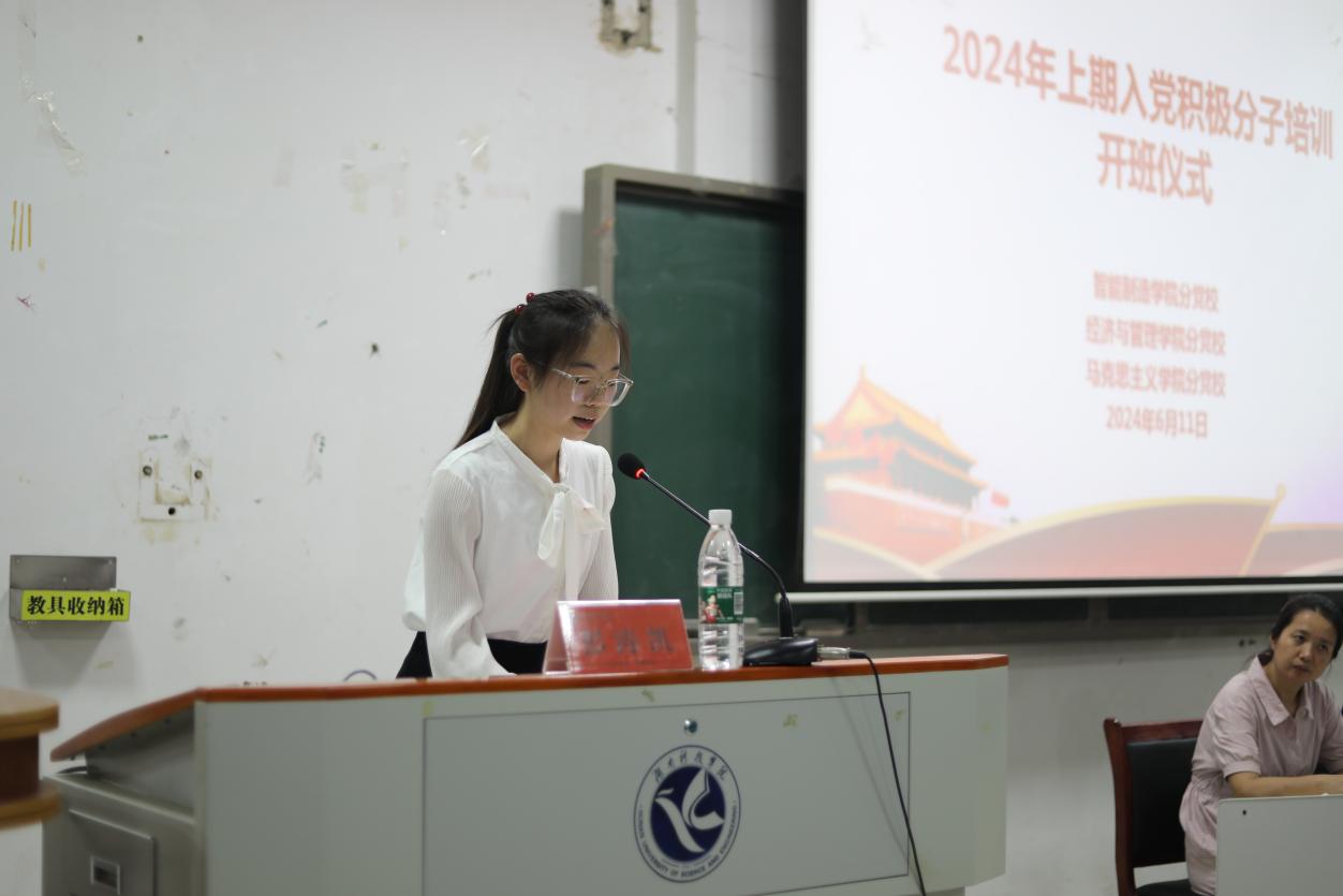 开班仪式在奏唱《中华人民共和国国歌》中拉开帷幕,我院欧阳艳兰同学作为学员代表发言,表达对能参加此次培训机会的珍惜,并代表全体学员坚定的表示会认真完成培训的承诺。智能制造学院党总支书记杨攀开班致辞,他提出三点希望,一是提高认识,端正入党动机;二是加强理论武装,筑牢信仰根基;三是增强宗旨意识,练就过硬本领。