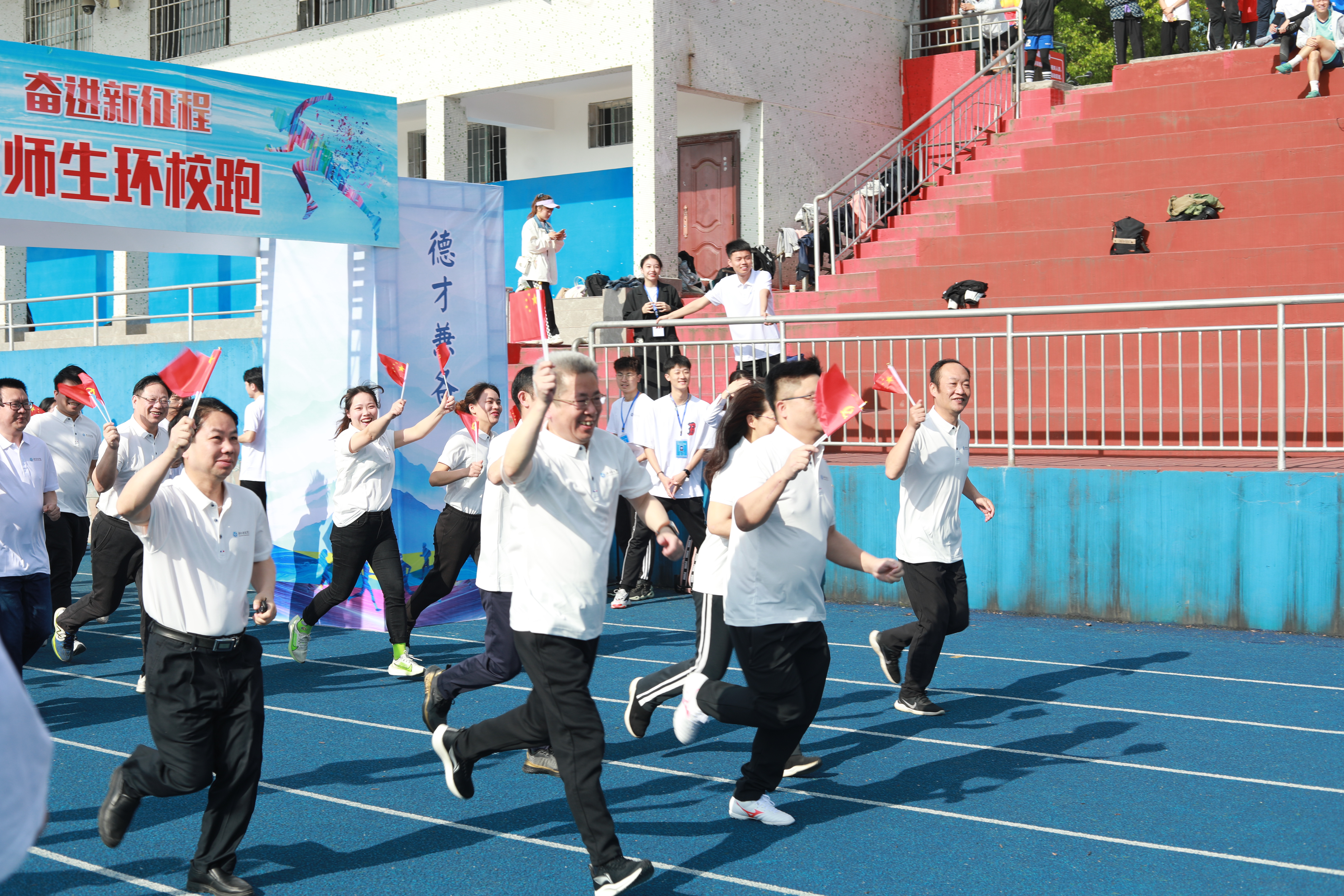 随着开跑指令响起,参与活动全体教职工、学生代表在校领导的带领下,精神饱满、热情洋溢地从学校田径场出发,沿着指定的路线,陆续穿过集贤楼、行政楼、休闲文化广场、明理楼等标志性建筑和文化景观,进行3公里环校跑。