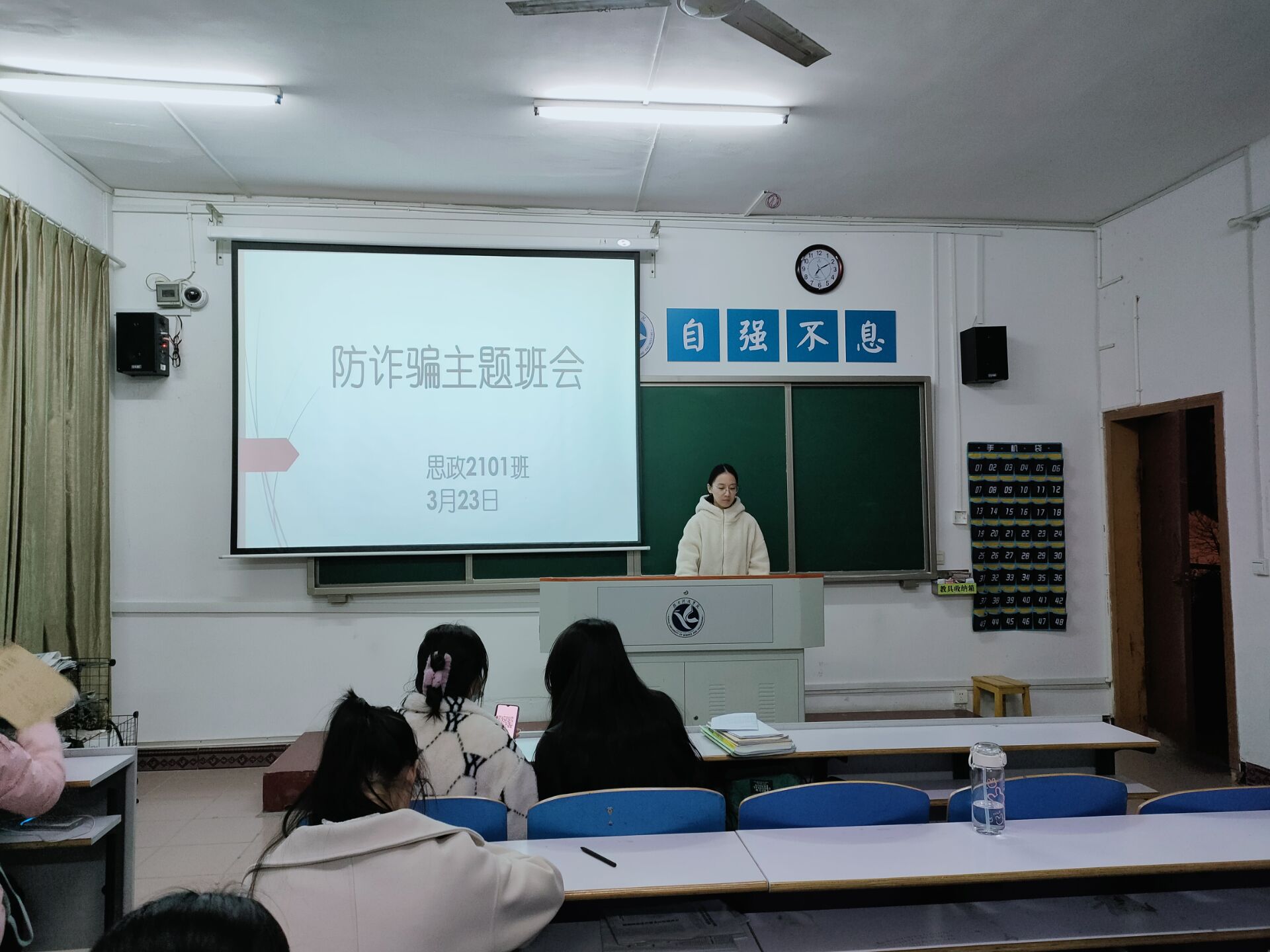 本网讯(记者 张一帆)近年来,电信网络诈骗呈作案手段多样化、新型化,作案群体呈年轻化,迅速增长趋势。大学生防范意识弱,心地善良,易成为骗子实施诈骗的目标群体。为再次普及反电诈知识,提高反电诈意识, 3月23日晚,马克思主义学院于鹤鸣楼406、407教室开展防电信诈骗主题班会。