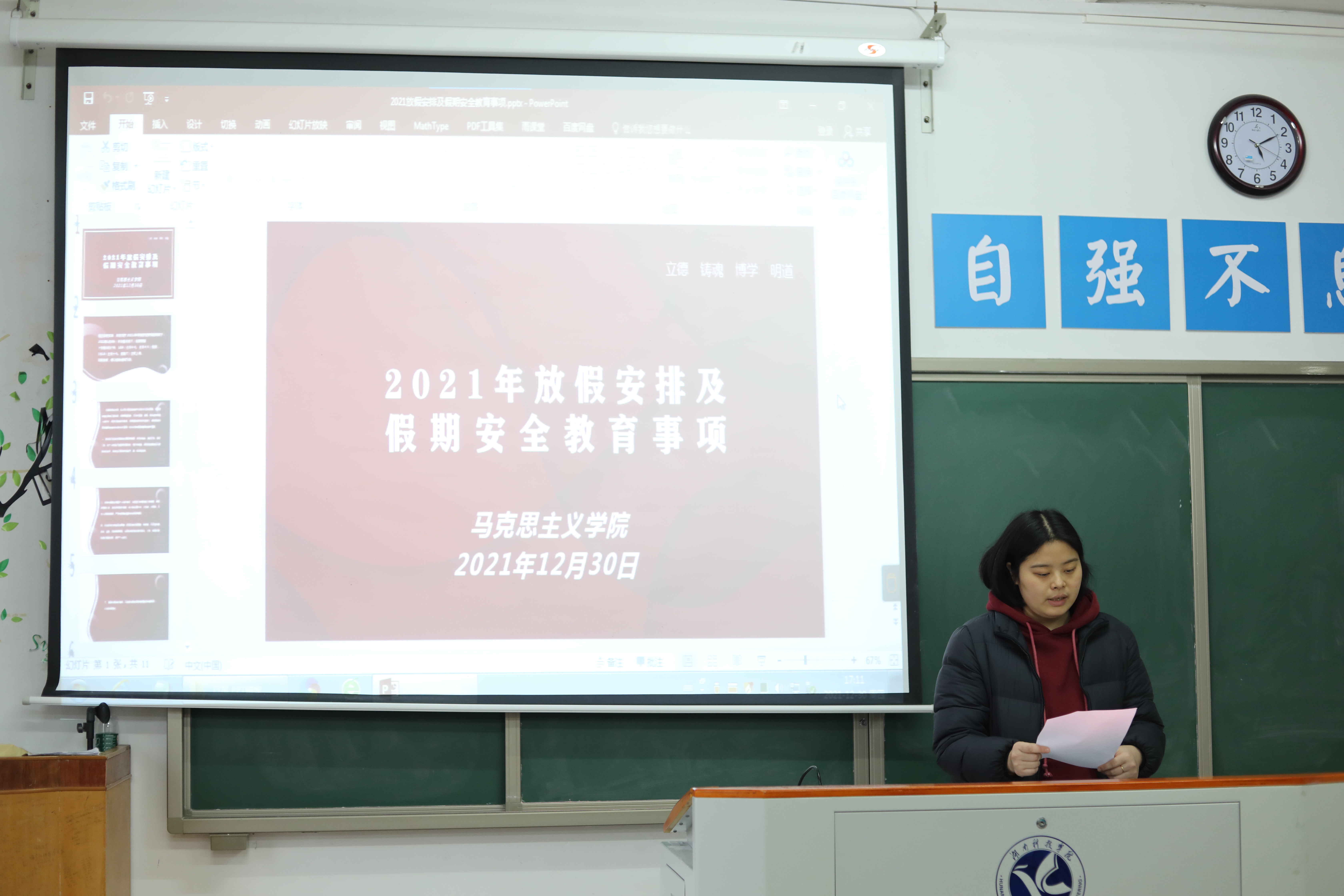 本网讯(记者 李金)12月30日,马克思主义学院于鹤鸣楼501教室举办假期安全教育大会,大会由辅导员胡非主讲,全体20级21级学生参加。